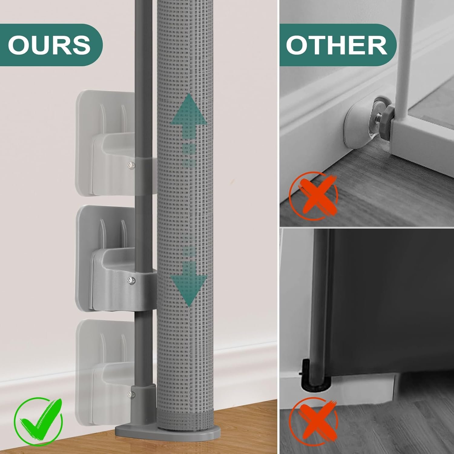 Avoid Baseboard Installation: The lower bracket of child gates for doorways can be moved up and down to fit different baseboard and easy to use. Adjust the lower bracket height for a precise fit, ensuring protection without damaging the substrate, allowing for an effortless installation