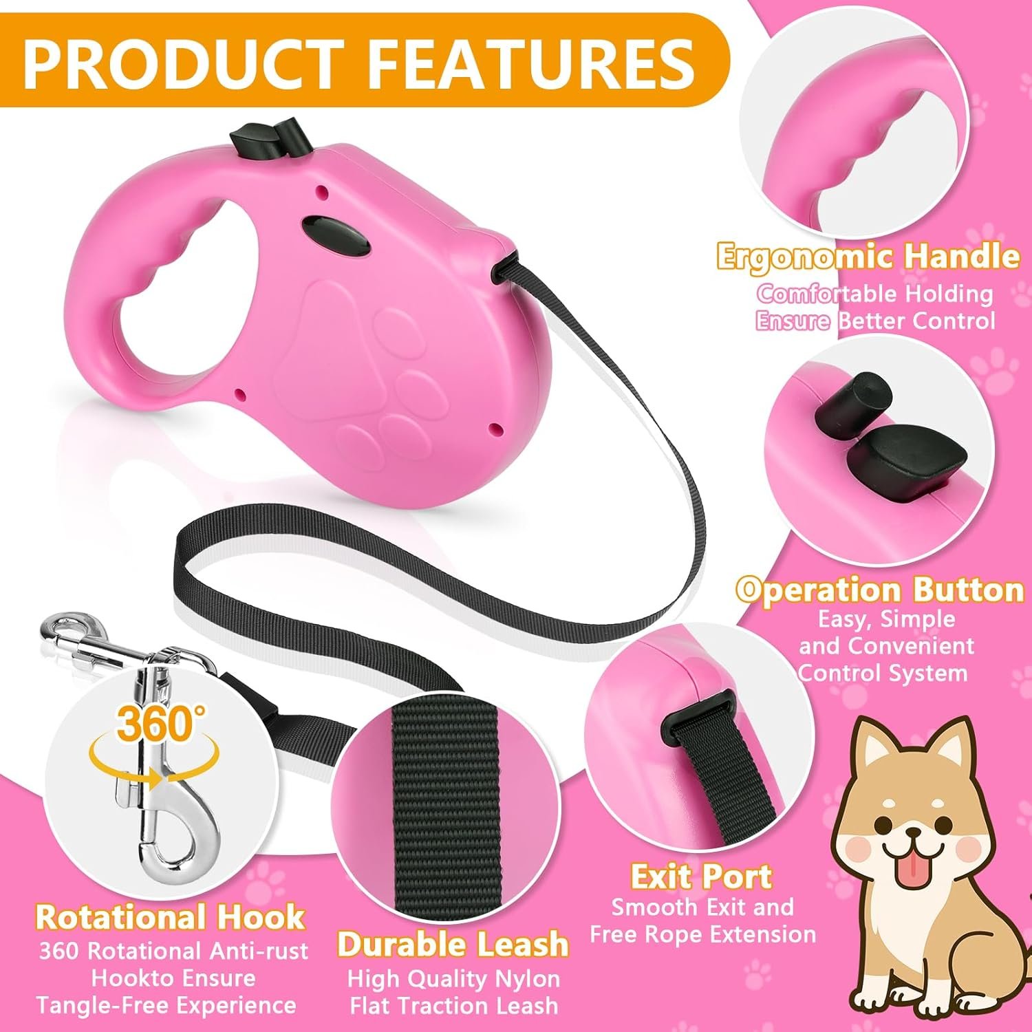 DURABLE AND RELIABLE -Crafted With 16ft High-Strength Nylon Tape, This Retractable Dog Leash Is Perfect For Everyday Walks And Suitable For Dogs Under 77 Pounds.