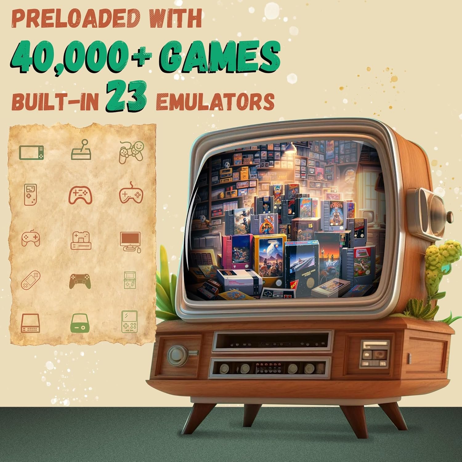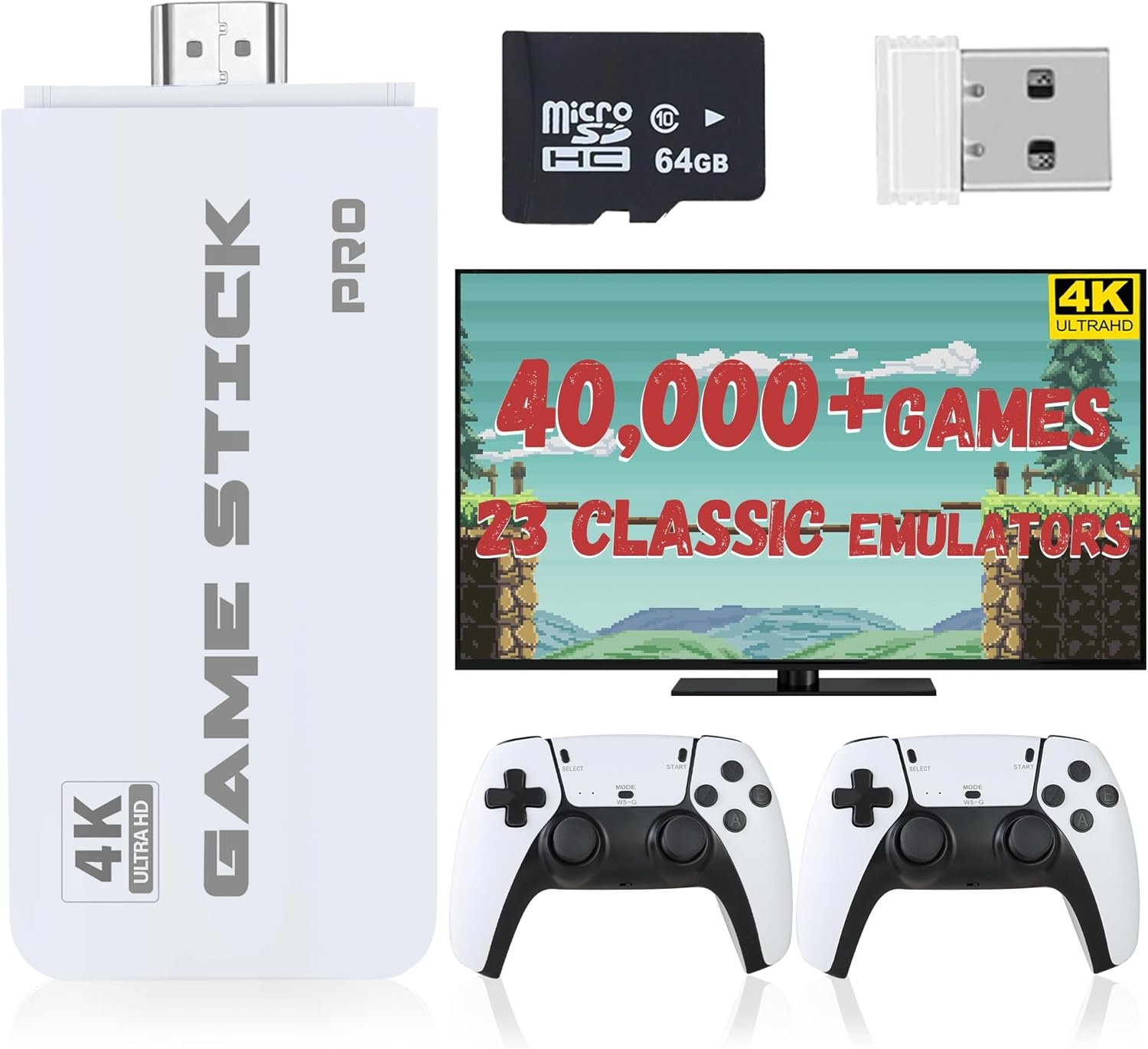 Retro Gaming Console – 40,000+ Classic Games, HDMI Plug & Play Game Stick, Dual Wireless Controllers, 23 Emulators, Save & Search Support, Gift for Kids & Adults (64GB)
