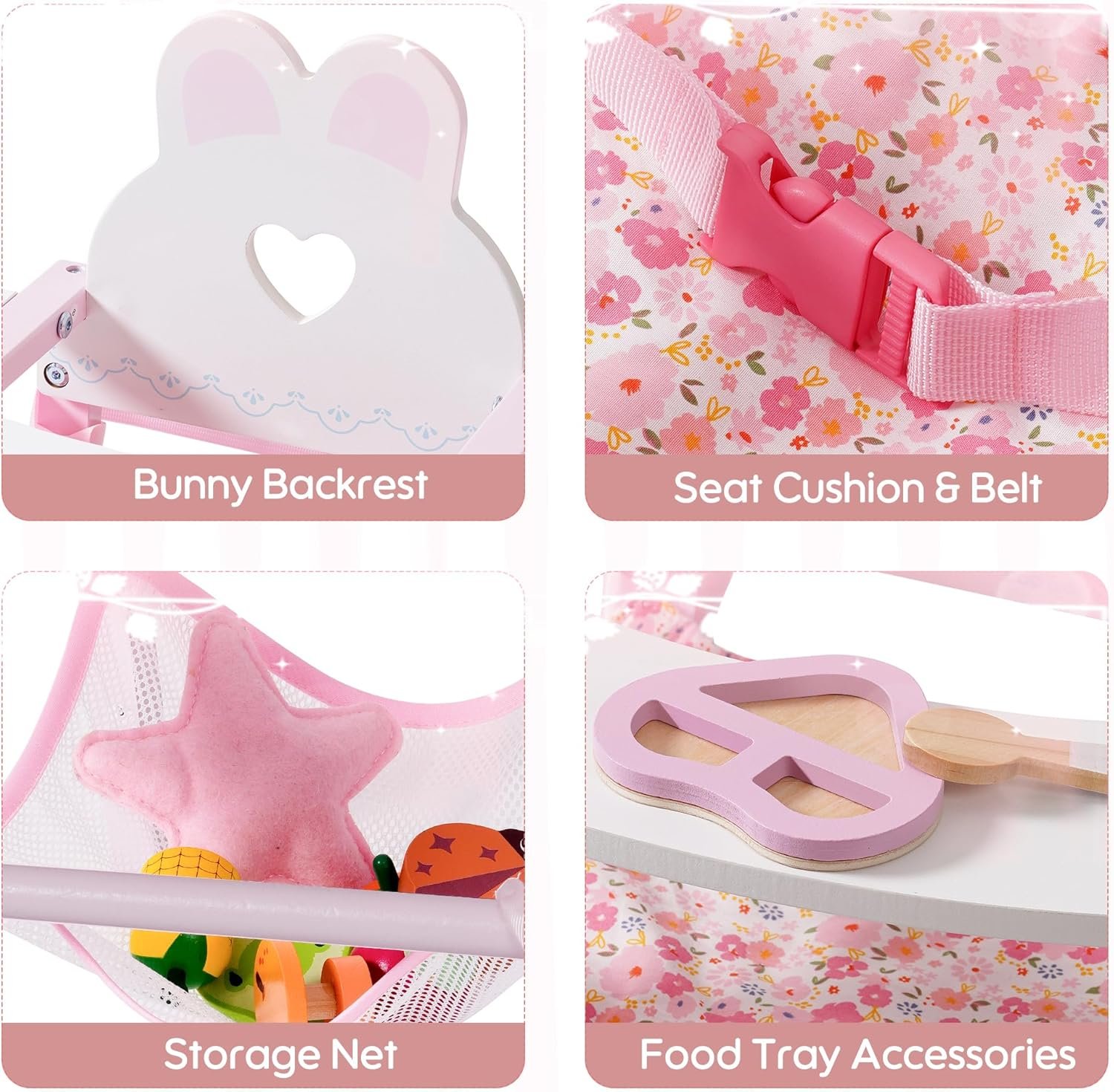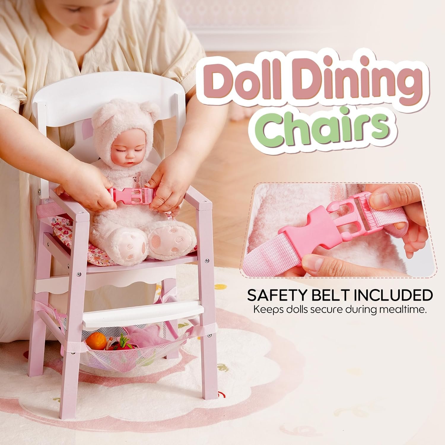 【Comfortable Cushion & Safety Strap】Includes a printed seat cushion for extra comfort and a built-in safety belt to keep dolls secure while seated—encouraging responsible caregiving during pretend play.