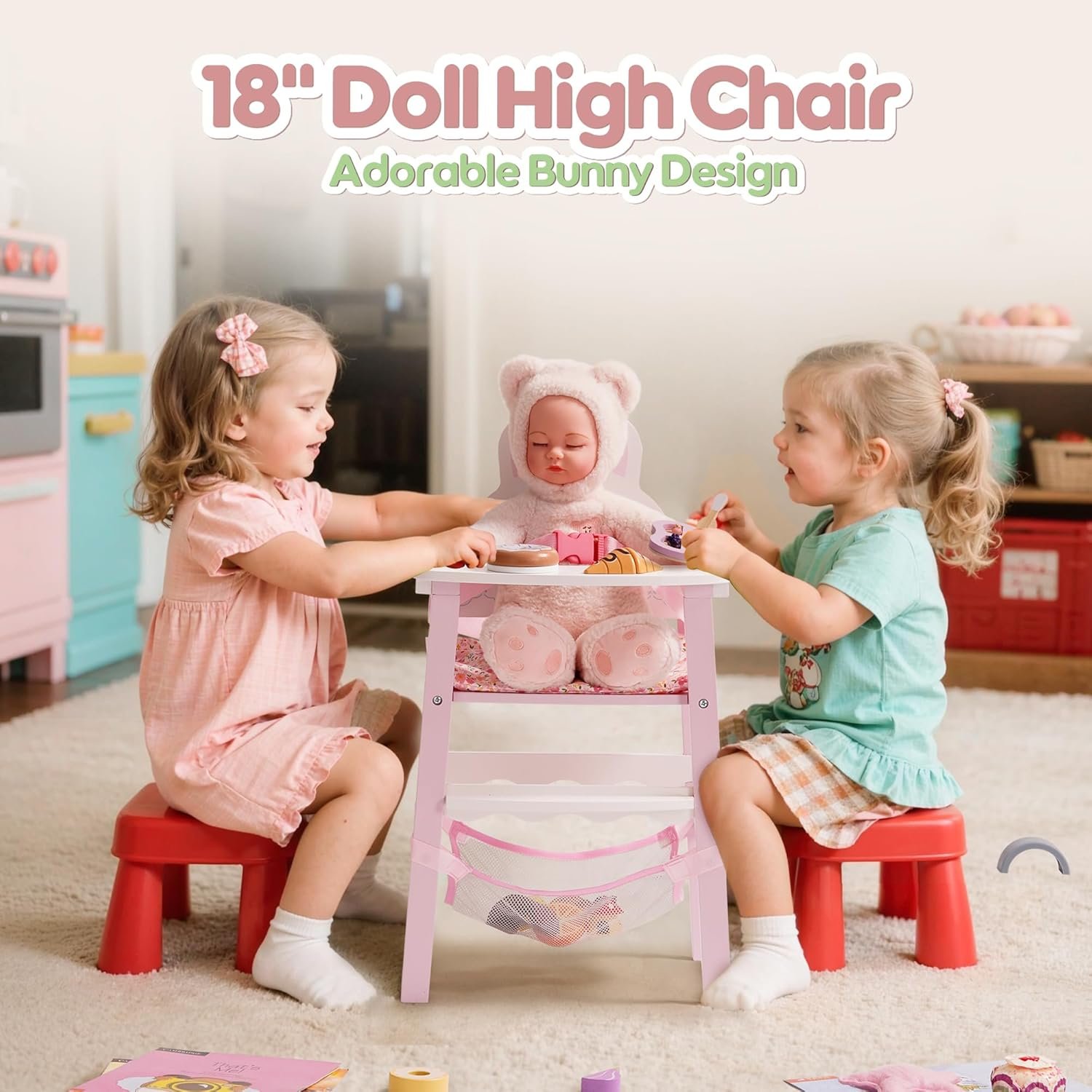 【Liftable Food Tray with Play Accessories】Designed for interactive fun, the food tray can be easily lifted and lowered to simulate real feeding. Comes with cute food tray accessories to spark imaginative role-play and enhance mealtime storytelling.