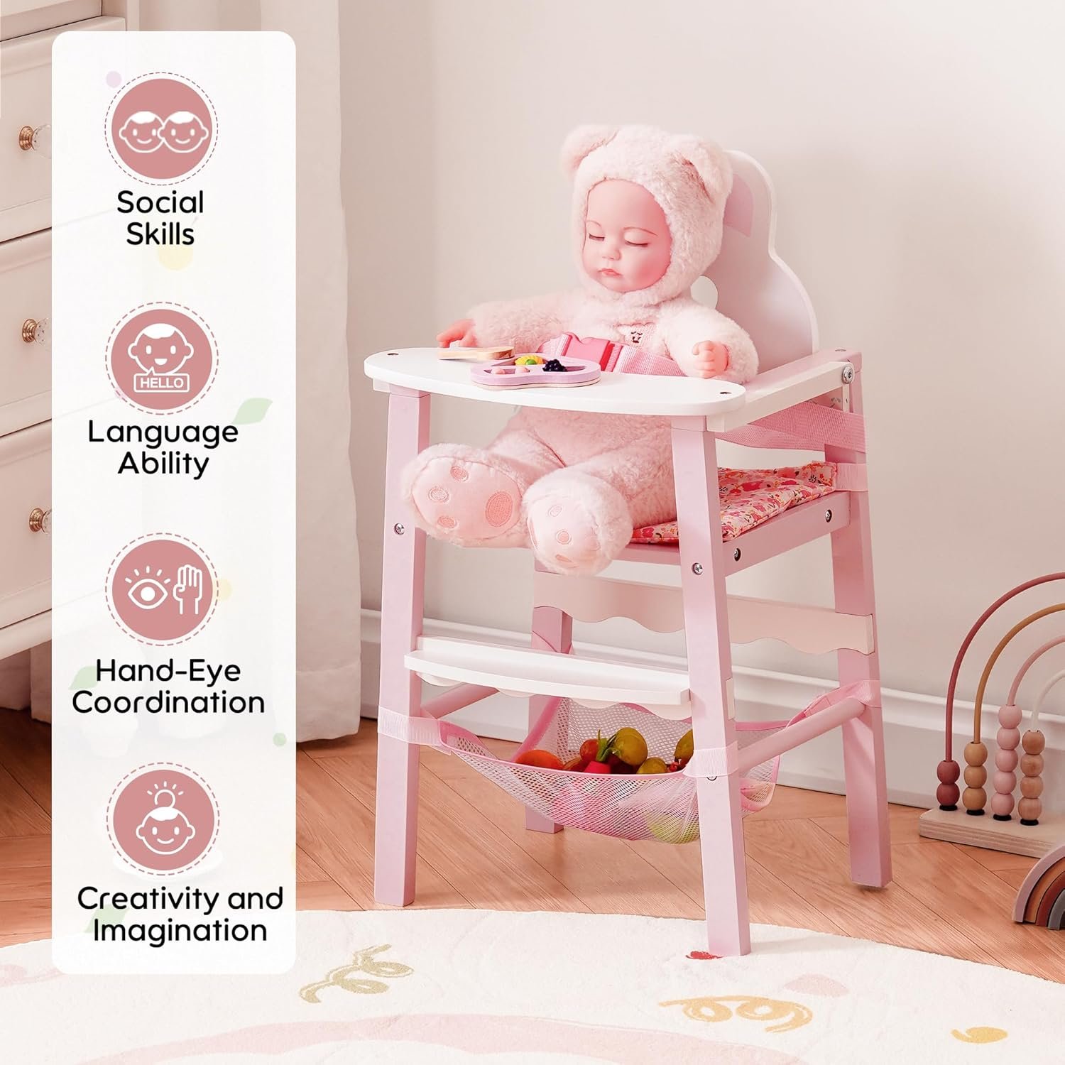 【Built-in Mesh Storage Basket】A handy storage net under the seat lets kids organize and store baby doll accessories, bottles, toys, or small outfits—teaching them tidiness while keeping essentials within reach.