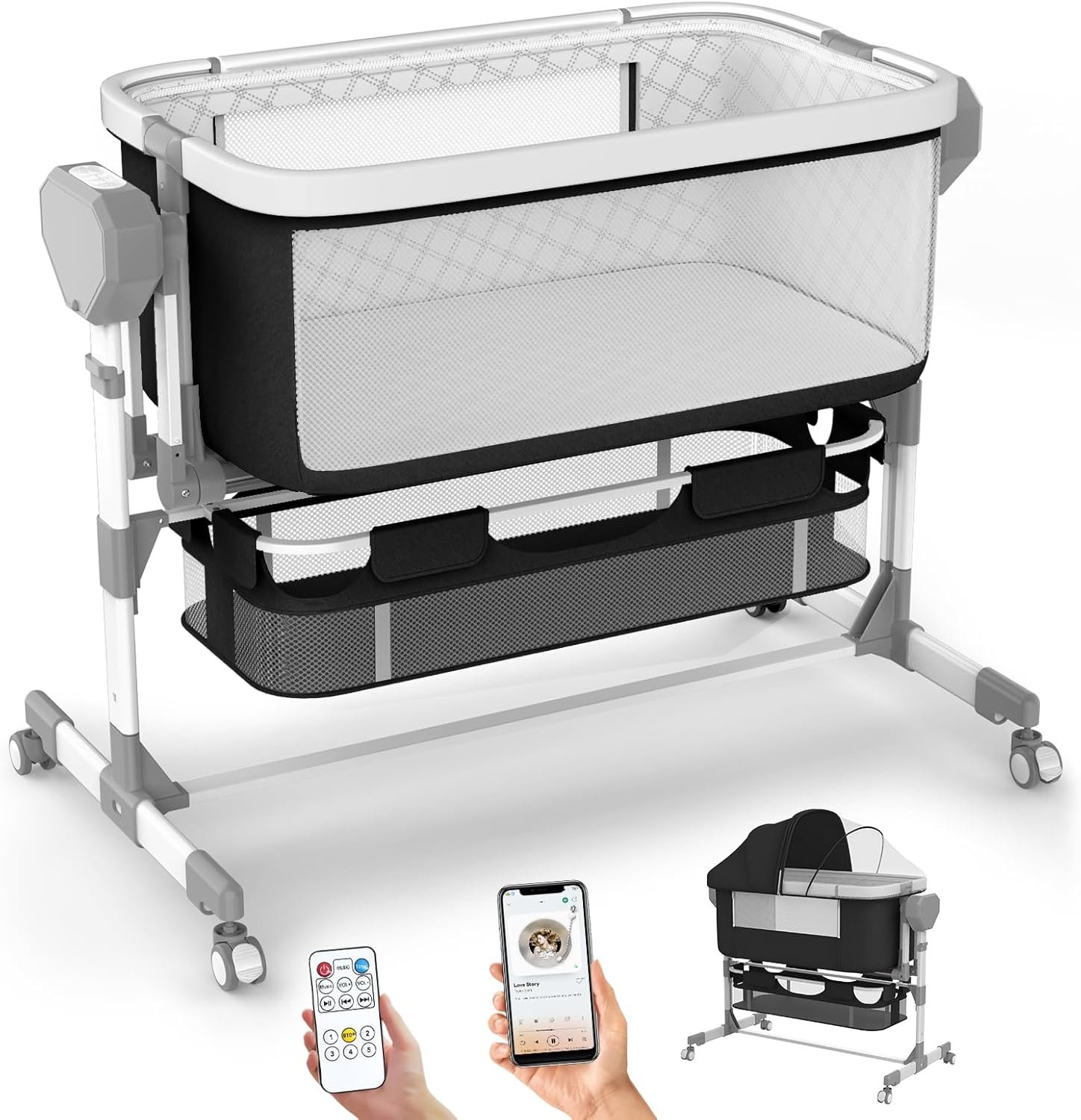 【Built-in music + Bluetooth 5.0】Bassinet with wheels Built-in 4 soothing music to soothe the baby’s emotions. In addition, built-in Bluetooth 5.0 can play music in the mobile phone