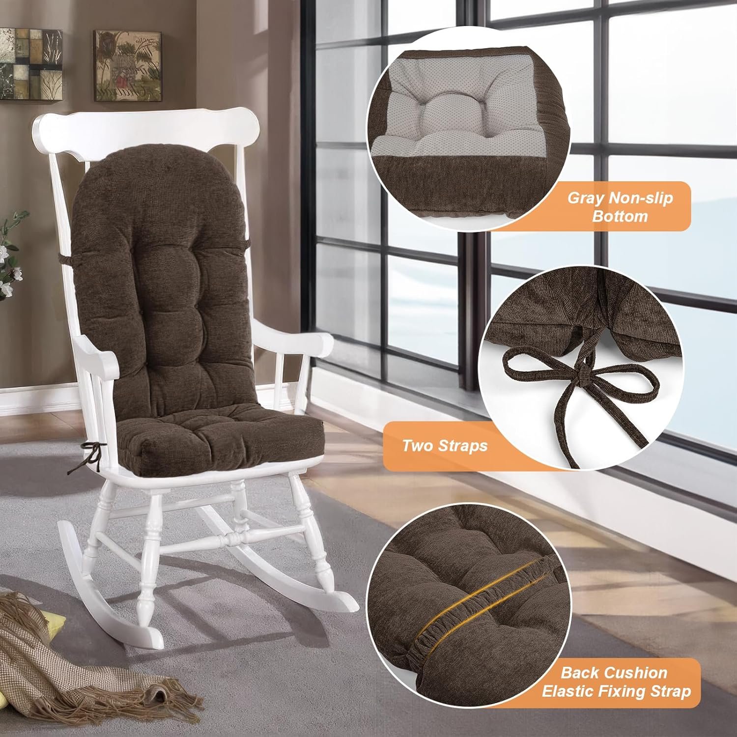 Secure Fastening & Stability: Equipped with two ties and a gray non-slip base, this cushion securely fastens to your rocking chair. An elasticized tie at the back further enhances stability and a custom fit
