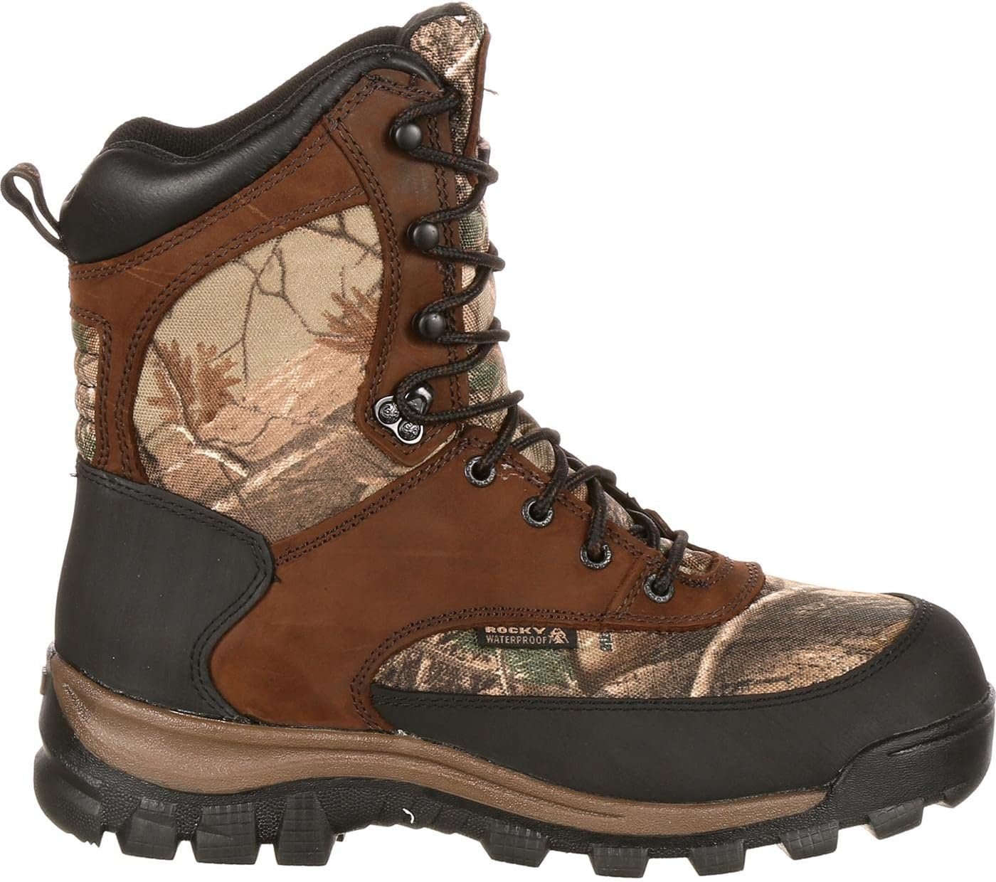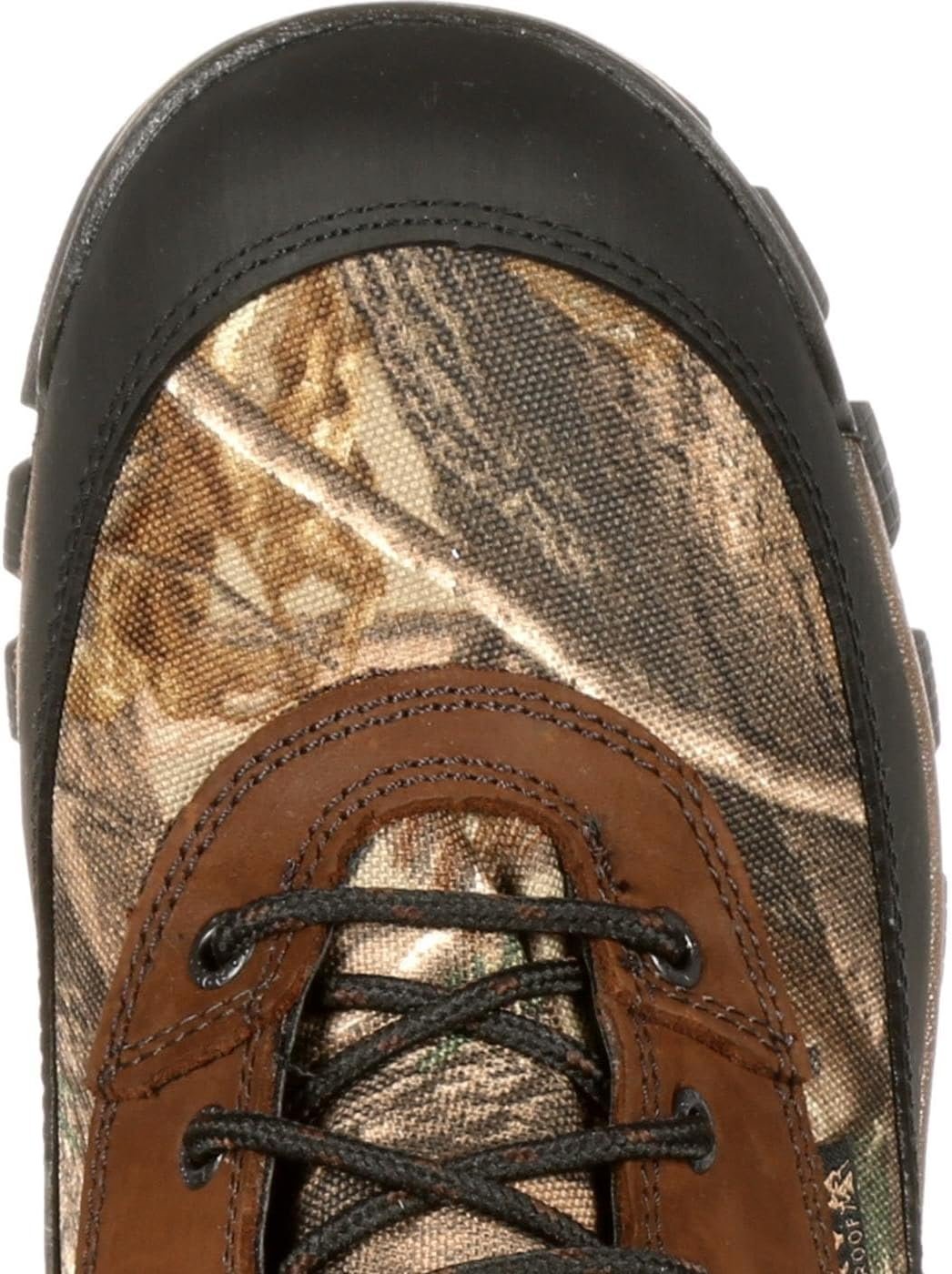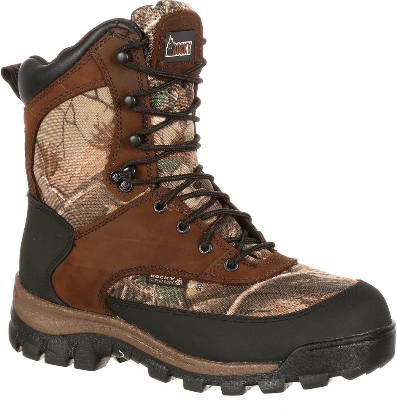 Rocky Core Waterproof Insulated Outdoor Boots RealTree Camo are great for hunting, with hiking or working outside. Inside, 400 grams of 3M Thinsulate Ultra Insulation provide protection from the cold without adding bulk. Rocky Waterproof Boot construction makes sure your feet stay dry. The upper is a combination of full-grain leather and 900-denier nylon for strength and resistance to abrasions. A raised toe bumper and rubber on the toe and heel protect the footwear from cuts and abrasions in these hunting boots. The woven Rocky pull loop on the back of these 8-inch boots helps you get the boots on easily. The hard-wearing outsole is durable and aggressive to improve your stability and traction as you walk across uneven, rough or icy terrain. Comfort comes from a removable EVA footbed, as well as a padded collar and padded tongue. You want to get the most out of your hunting and outdoor experiences; lacing up these Rocky Core insulated waterproof boots helps you do that.
