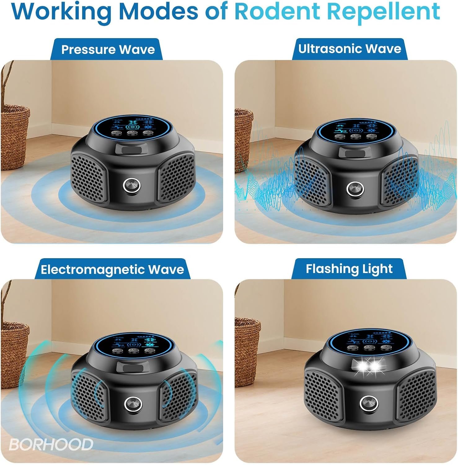 Four Working Modes: Our mouse repellent has three wave modes: ultrasonic wave, pressure wave and electronic wave, auxiliary flashing light mode, you can flexibly go to adjust the modes according to your needs to ensure effective indoor protection.