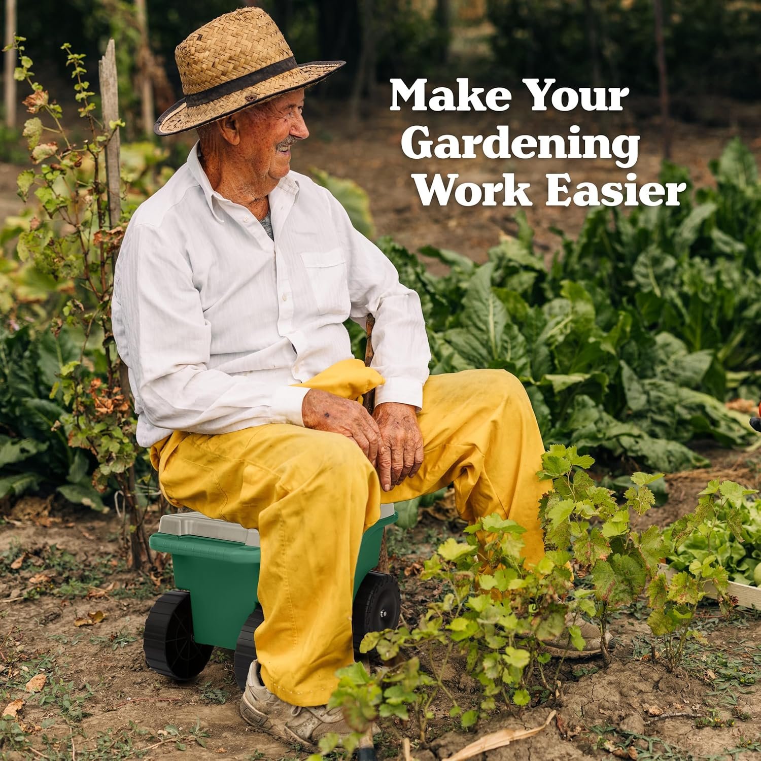 ROLLING GARDEN CART WITH SEAT – This garden stool is ideal for anyone eager to ease back and knee pain when planting and weeding, as its lid offers a sturdy seat that makes low-to-the-ground tasks much easier, with less need for crouching and stooping.