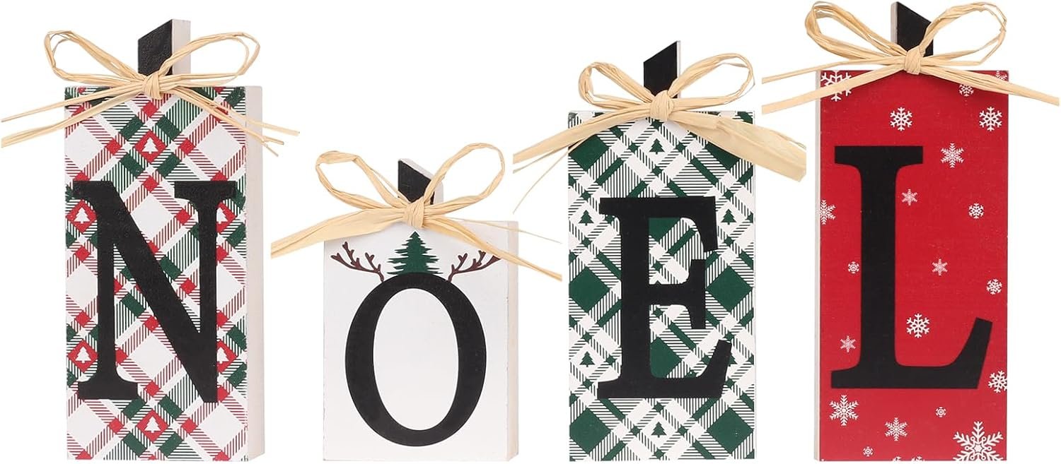 RoseCraft Christmas Decorations, 4PCS Rustic Wooden NOEL Sign Table Decorations, for Home Farmhouse Indoor Holiday Party Decor.