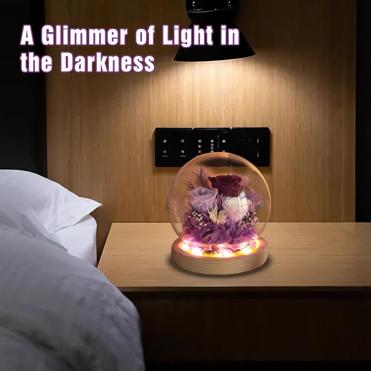 Multi-Functional: Three roses elegantly presented in a glass dome with LED light embedded in the petals to display the rose in a stunning display during the day and night, it can serve as a decoration in any room, a night light in the bedroom, and a keepsake to remember special occasions.
