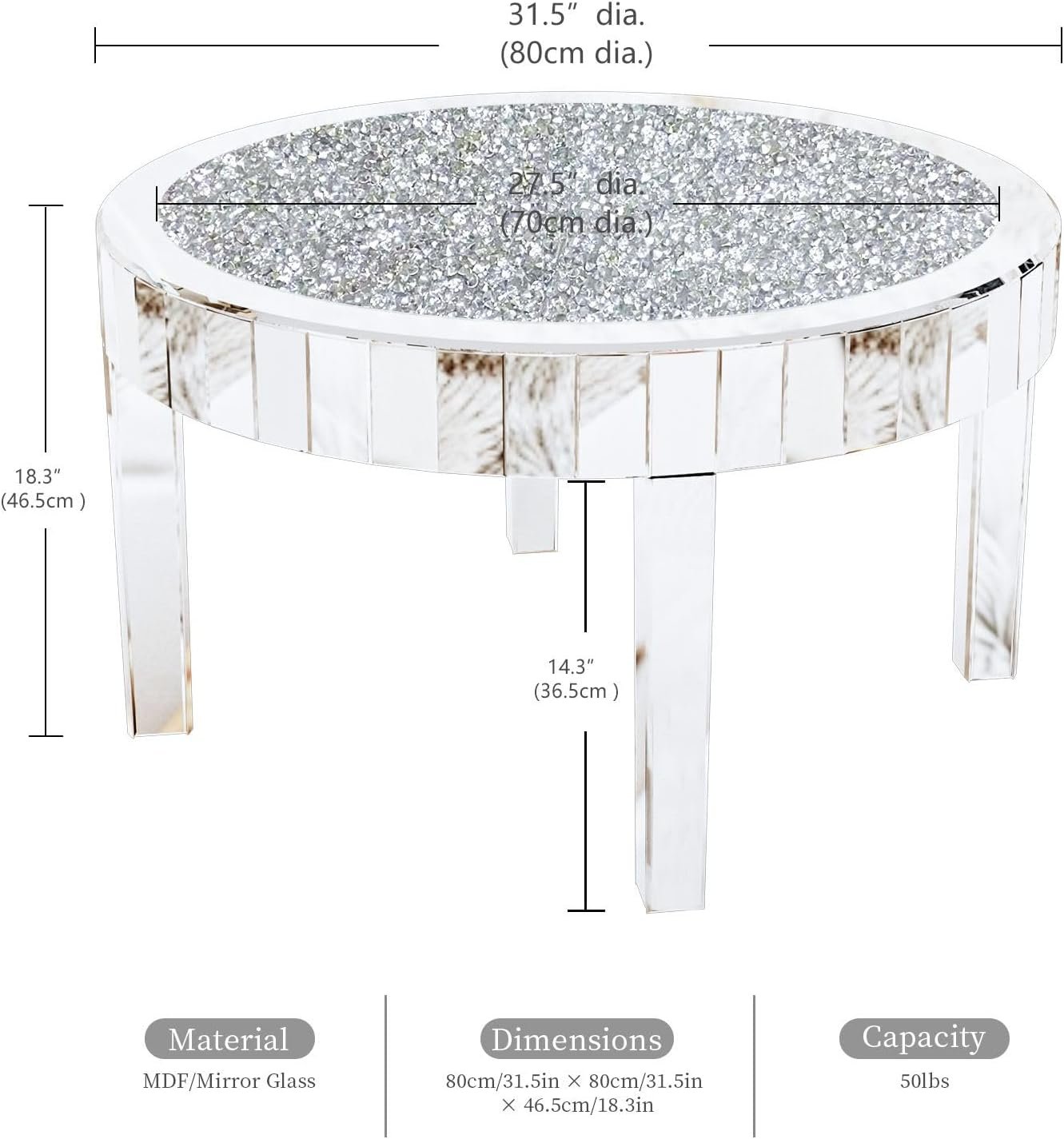 Round Mirrored Coffee Table: 31.5 inches Large Decorative Bling Crushed Diamond Tabletop with Silver Mirror Crystal Edge Frame and Legs Luxury Modern Home Decor for Livingroom