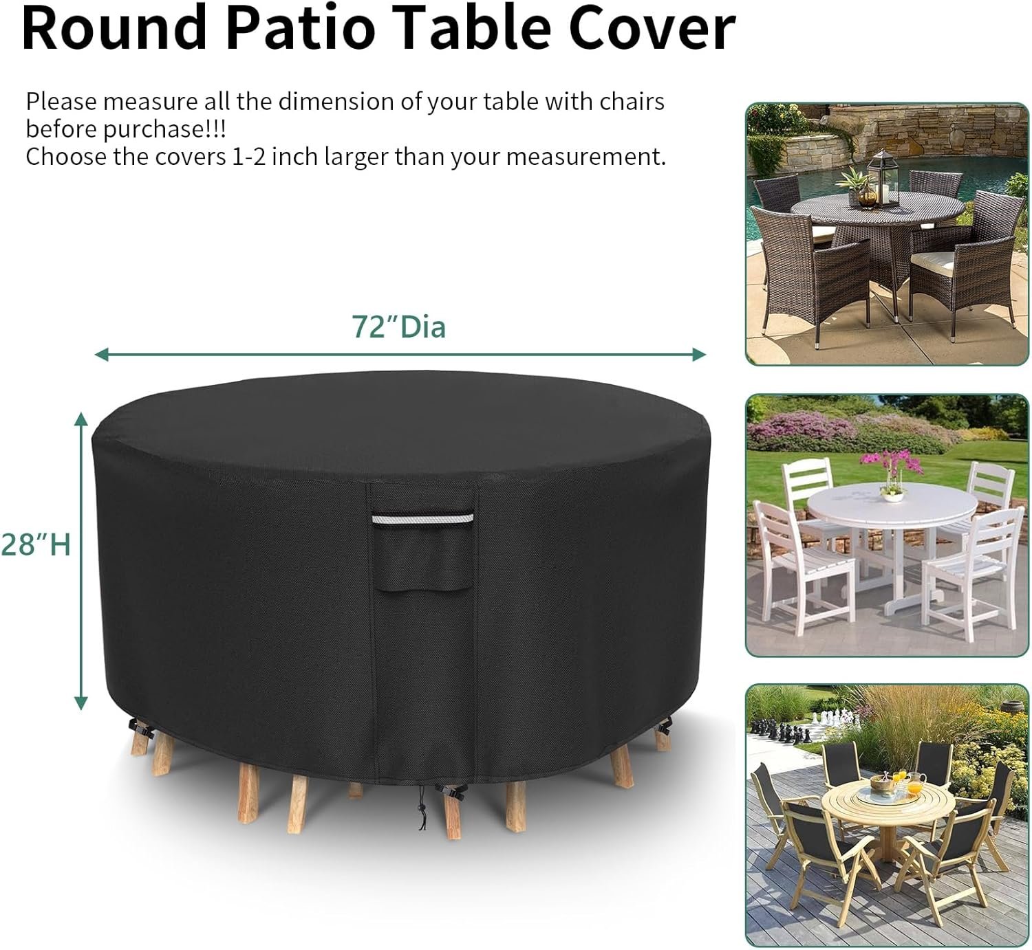 [Universal Size]: Size of the round patio cover is 72″Dia x 28″H. Fits patio round table & 4 chairs set total up to 70 inches diam. Please measure the dimension of your deck furniture set before purchasing.