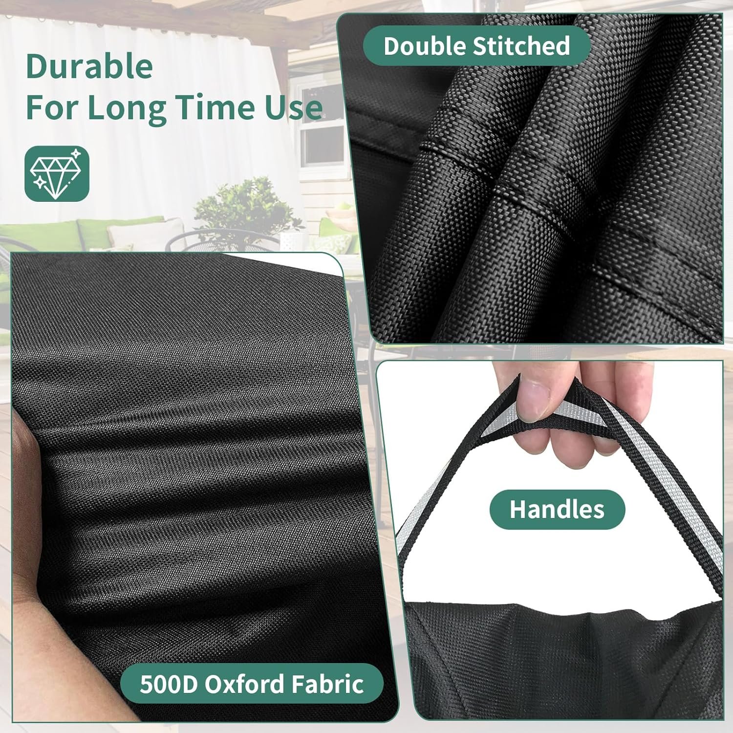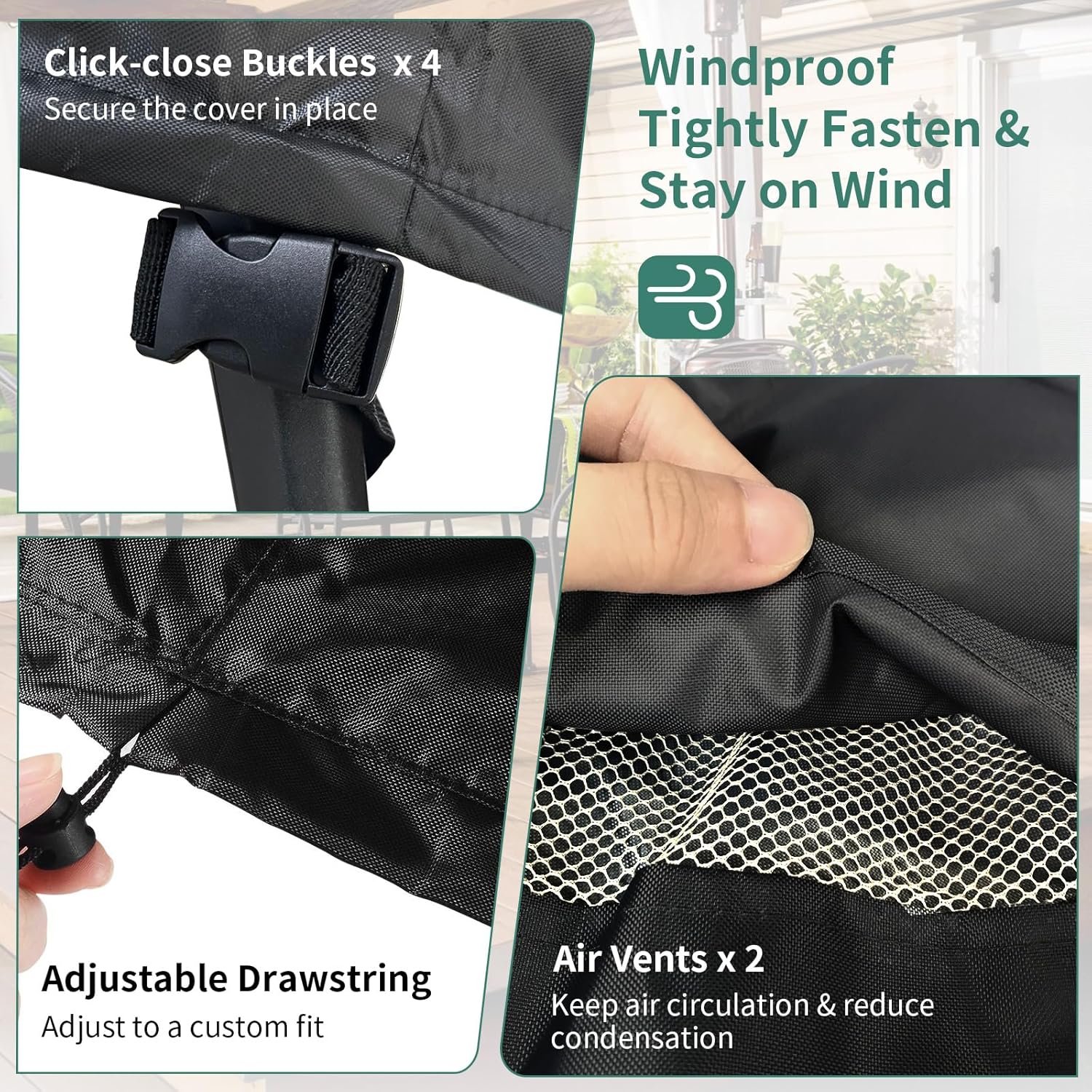 [Windproof & Anti-Condensation]: Covers for patio furniture equipped with 4 windproof buckles & 2 adjustable drawstring, can firmly fix the outdoor furniture cover without being blown away by strong wind. 2 air vents Keep air circulation, reduce inside condensation.