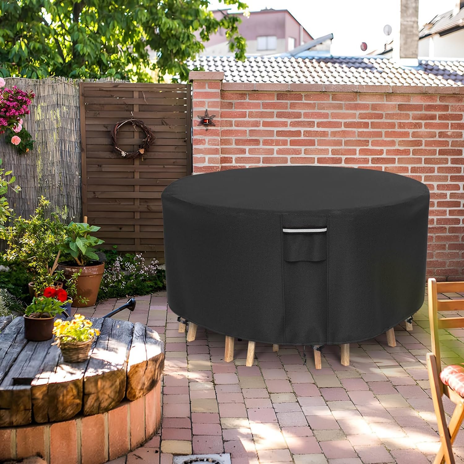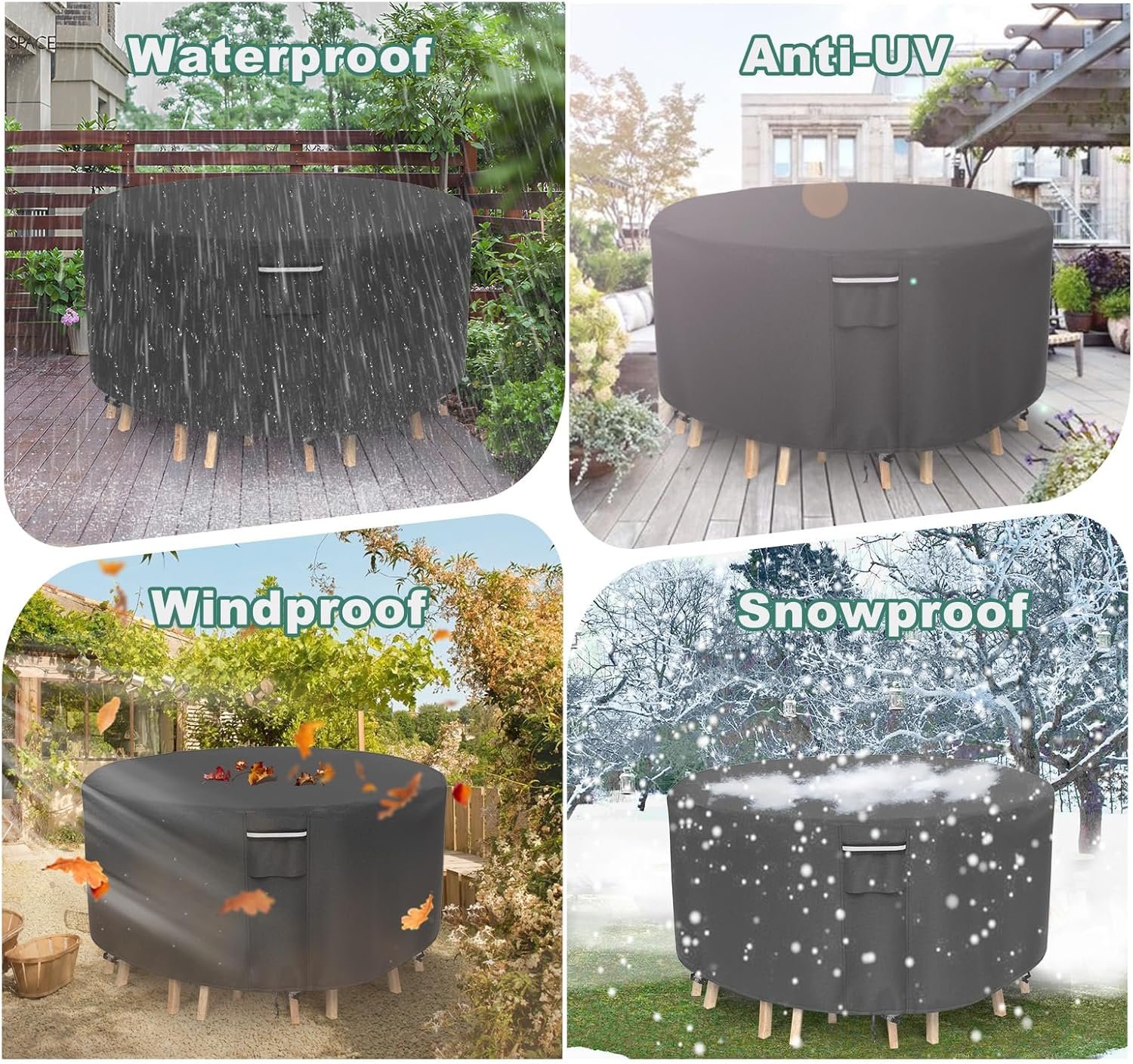[Durable for All-Year protection]: Outdoor table cover made of heavy duty Oxford fabric with double stitching seams. makes it has excellent tear-resistance and longer lifetime, providing maximum protection for your outdoor furniture, Keep round outdoor table safe from rains, snows, dirt and sunlight all year round.