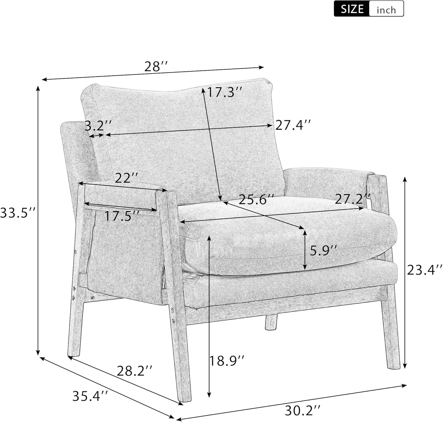 [SET UP DIMENSIONS]: 35.4D x 30.20W x 33.50H. Seat Dimension: 27.20W x 25.60D x 18.90H. Back: 17.30H. Cushion thickness: 5.90 inch.