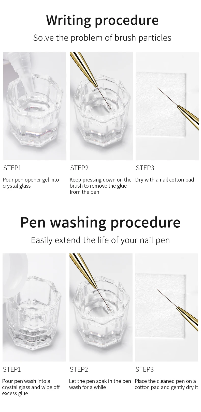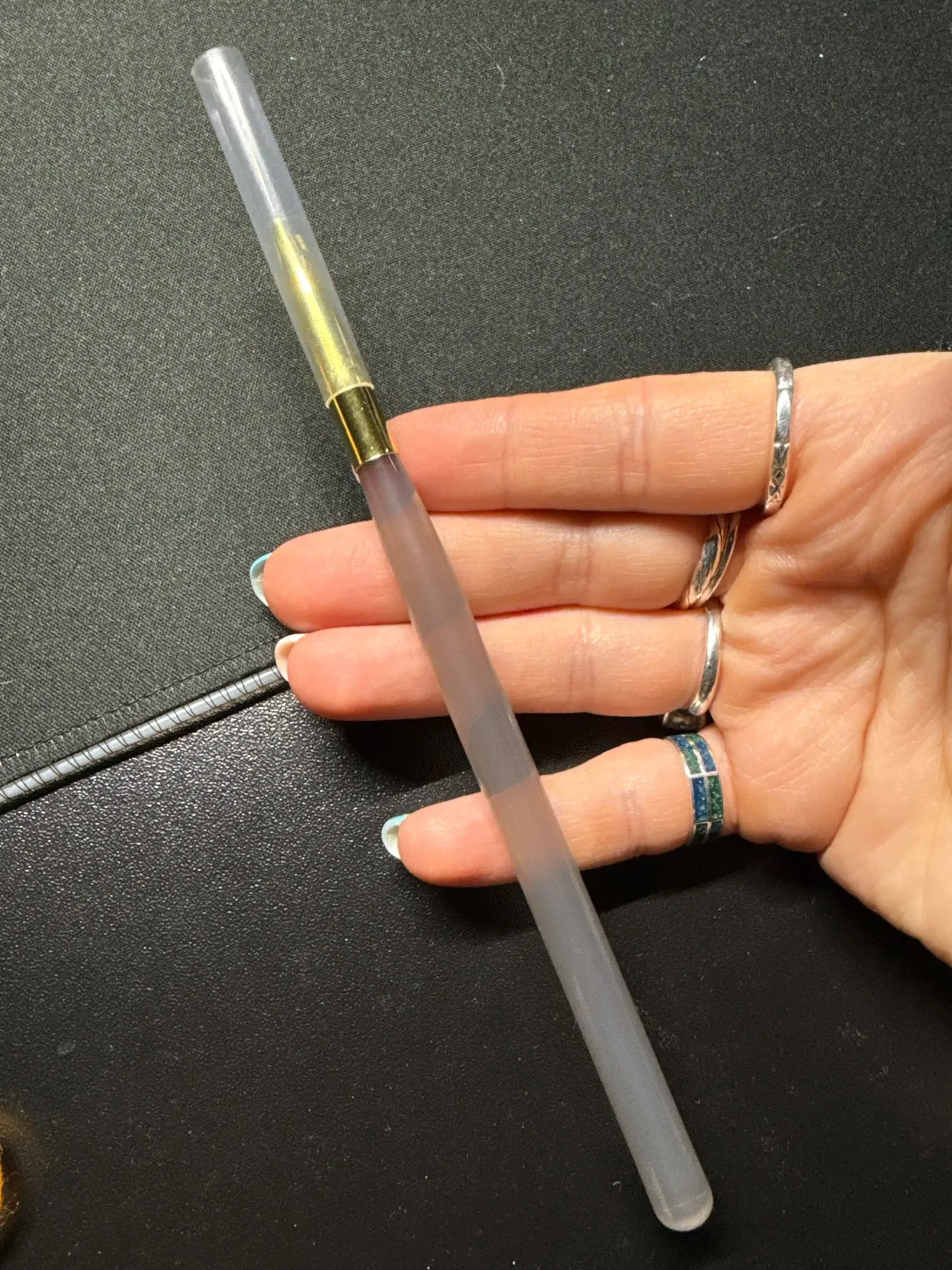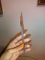 As pictured. Works great for nail art or reverse stamping. Cant wait to use for line work. Very nice and thin brush for details