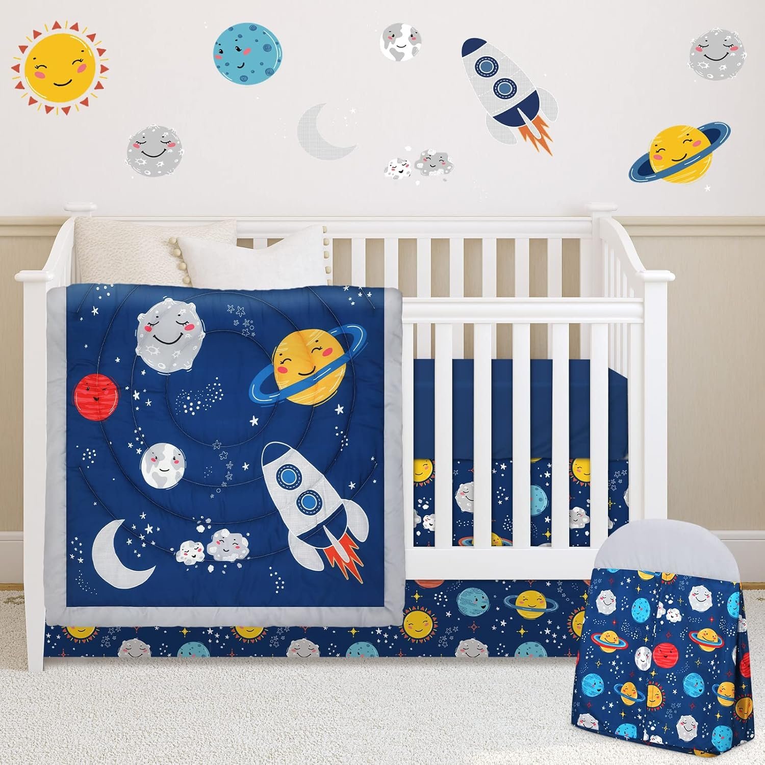 Rtteri 4 Pieces Baby Crib Bedding Set, Nursery Bedding Standard Size Soft Baby Bedding Set Including Crib Skirt, Blanket, Sheet and Diaper Stacker for Girls and Boys(Space)