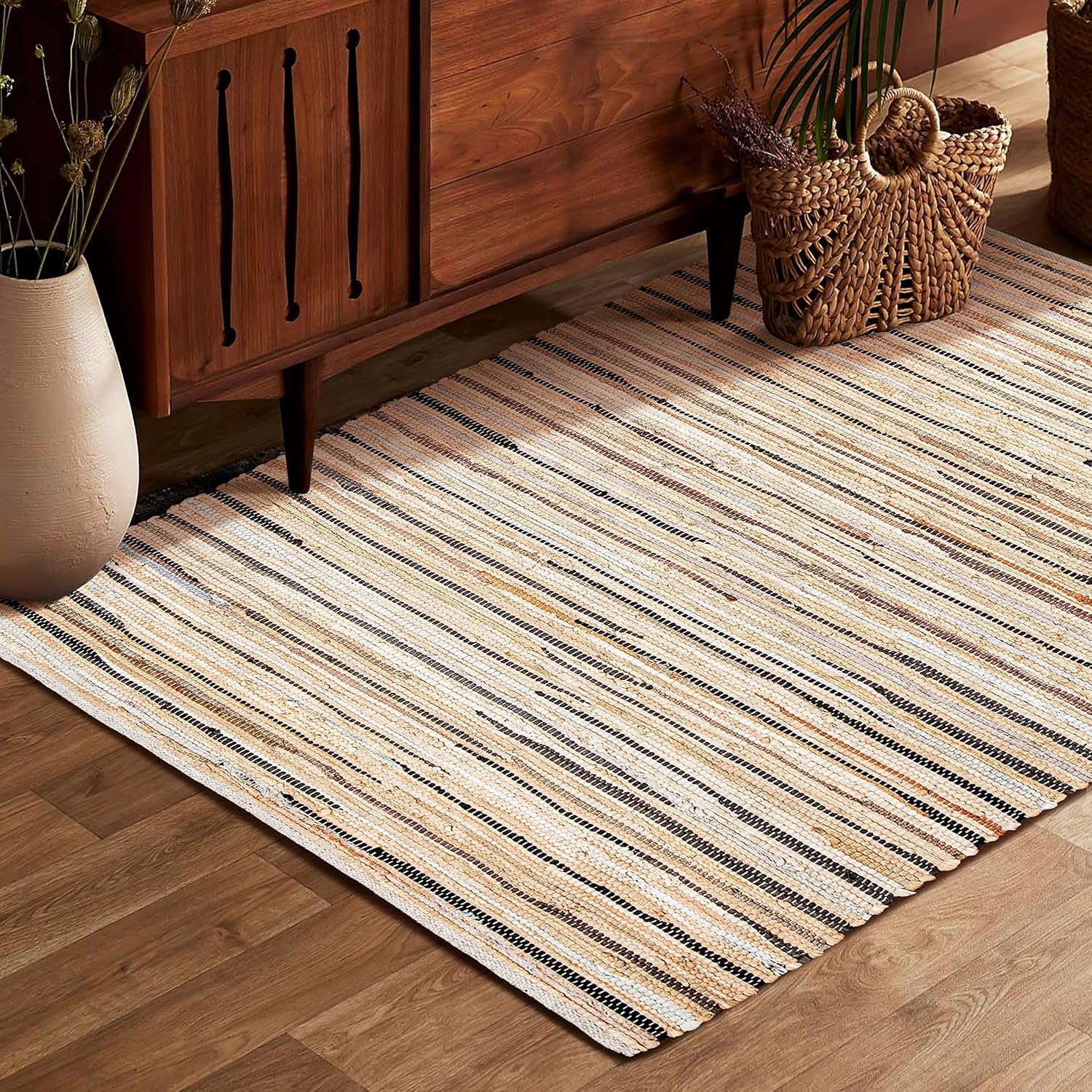 MULTIFUNCTIONAL HOME ACCESSORY:This cotton rug serves multiple purposes beyond floor coverage. Its woven texture and stylish pattern make it a decorative wall hanging, a table runner, or even a throw over sofas and benches. It works well as a layering piece over larger carpets, adding depth and warmth to any setup. Whether you’re using it as an artistic tapestry, furniture cover, or picnic blanket, this rug is as functional as it is beautiful.