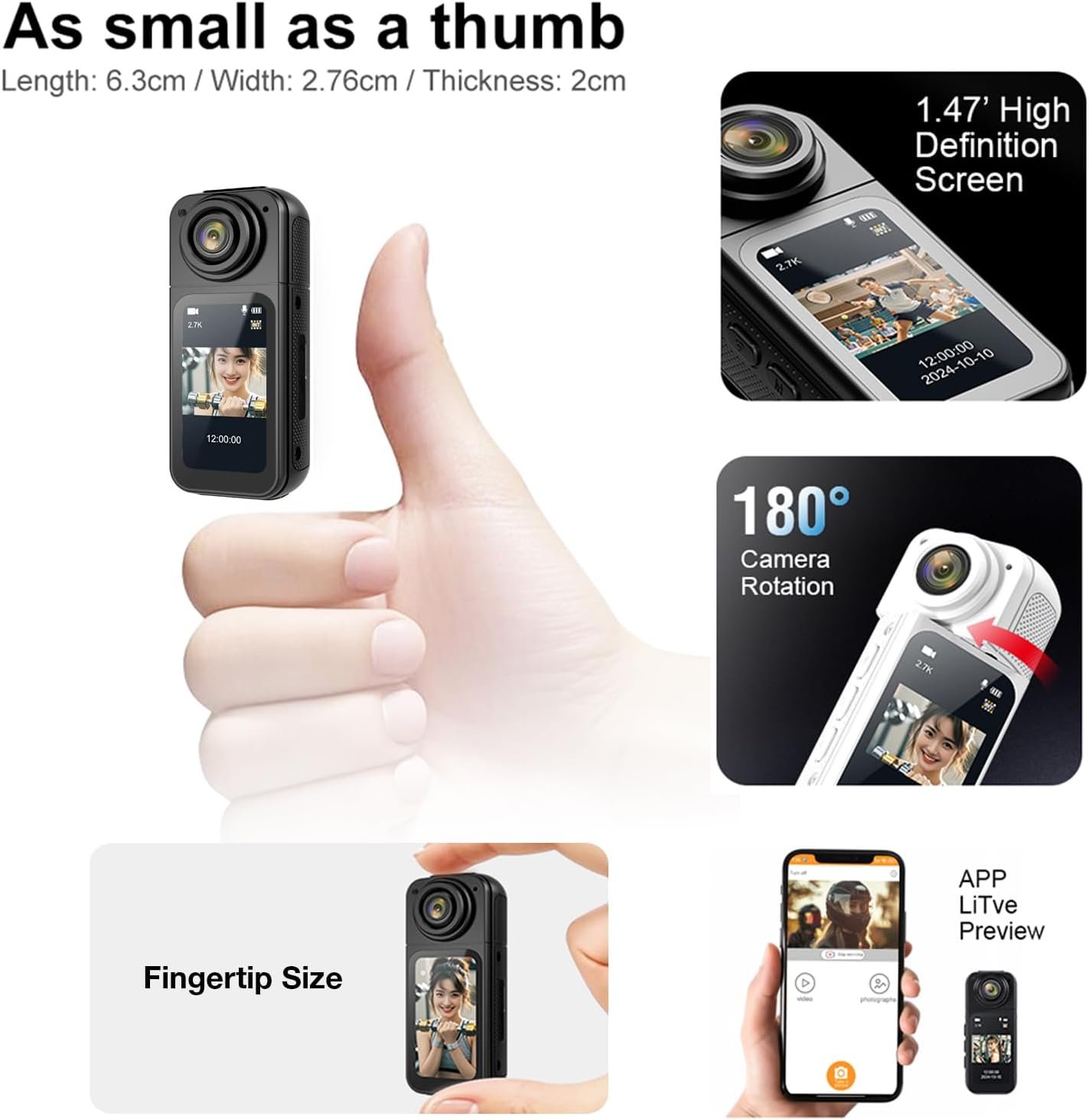 2.7K HD & 180° Rotatable Lens: Video resolution of the thumb camera is 2688*1520, which can meet your daily life recording needs. Body camera can rotate 180°. Bodycam can be adjusted to the desired angle as needed, and will no longer be restricted