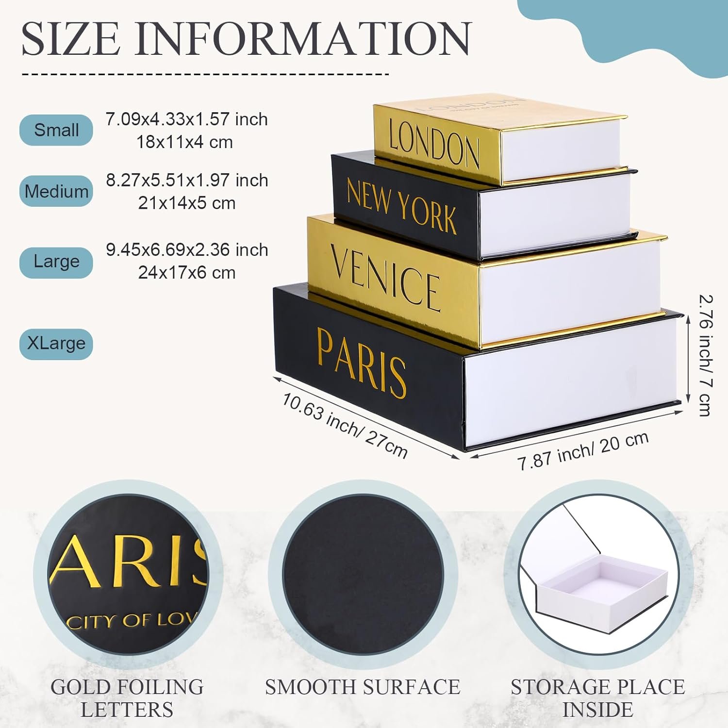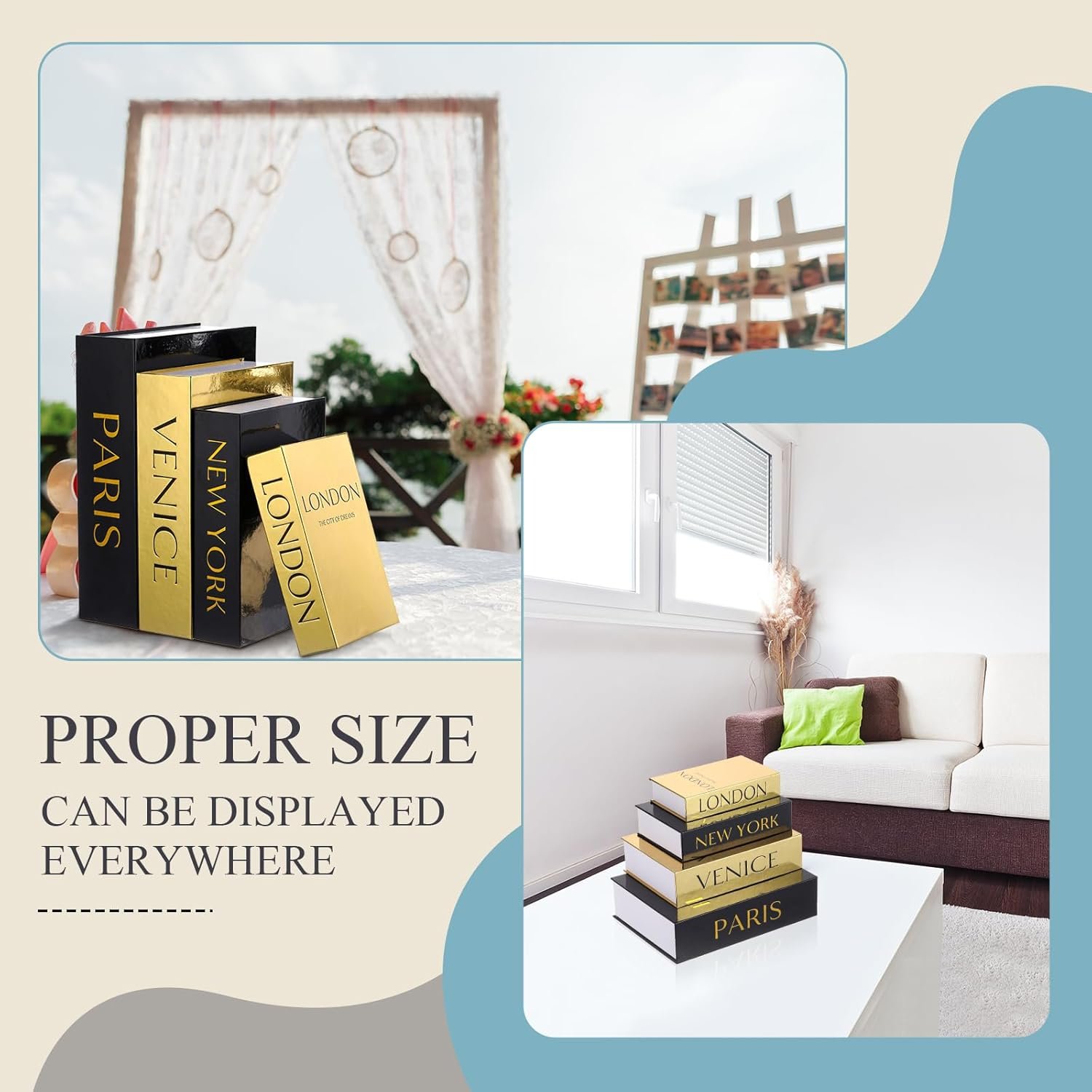 Suitable Size: this set of coffee table books has four sizes to choose from, namely 10.63 x 7.87 x 2.76 inches/ 27 x 20 x 7 cm, 9.45 x 6.69 x 2.36 inches/ 24 x 17 x 6 cm, 8.27 x 5.51 x 1.97 inches/ 21 x 14 x 5 cm, 7.09 x 4.33 x 1.57 inches/ 18 x 11 x 4 cm, which is very suitable for storing items of different sizes, such as jewelry, glasses, Christmas gift cards, photos, letters, etc