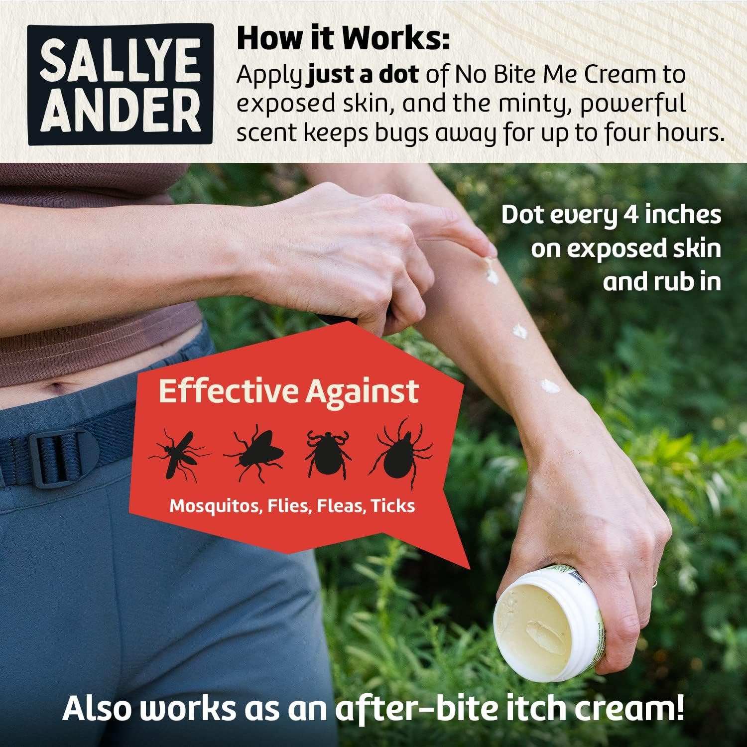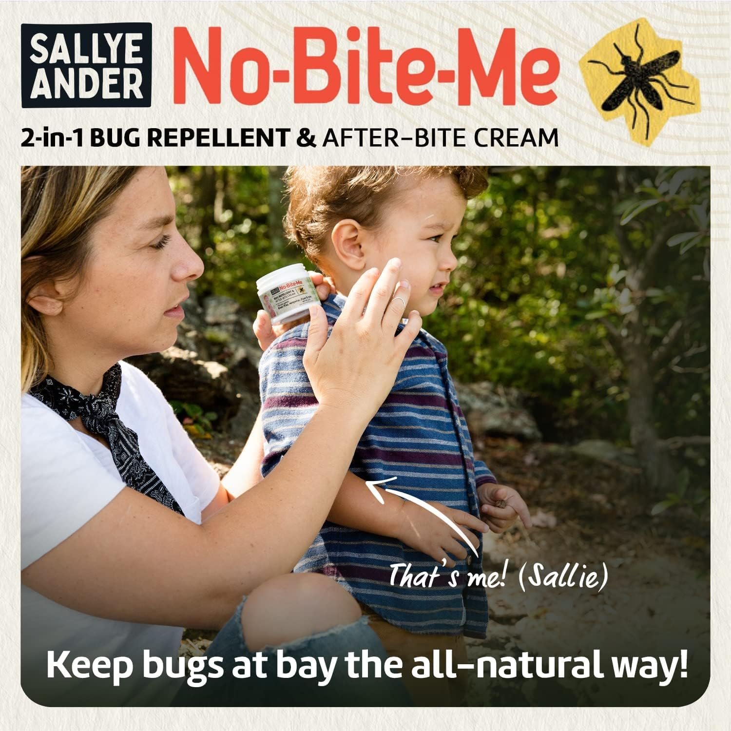 2-IN-1 BUG REPELLENT & AFTER-BITE CREAM: “No-Bite-Me” does it all! Our cream-based formula repels bugs AND relieves itchy, bug-bitten skin with soothing, moisturizing beeswax. Plus, it’s an all-natural bug repellent, baby safe, and beloved by moms everywhere.