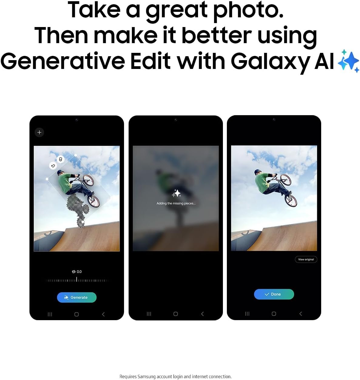 ¹Requires internet connection; results may vary by uniqueness, clarity and framing of circled image and related factors. ²Samsung account login required. Calls must be made using the native Samsung dialer. ³For text in Samsung Notes only (200 –4,000 characters); requires Samsung account login and internet connection. ⁴Requires Samsung account login and internet connection. ⁵Charger not included. Use only Samsung-approved chargers and cables. Do not use worn or damaged chargers or cables. An incompatible charger or cable can cause damage to your device and/or serious injuries. ⁶Based on average battery life under typical usage conditions. Average expected performance based on typical use. Actual battery life depends on factors such as network, features selected, frequency of calls, and voice, data, and other application usage patterns. Results may vary. ⁷Quick Share between Galaxy devices available with the following OS: smartphones and tablets with Android OS version 10.0 (Q) and One UI 2.1 or above, PCs running Windows 10 or later. Requires Samsung account and Wi-Fi and Bluetooth connection. Quick Share to iOS and Android devices available by sending shared link: individual files shared cannot exceed 3GB (for a total of 5GB per day) and link will expire after two days; requires a Samsung account and internet connection.⁸25W Super Fast charger sold separately. Super Fast Charging speed depends on battery level and other factors; use only Samsung-approved chargers and cables; do not use any worn or damaged chargers or cables; incompatible charger or cable can cause serious injuries or damage to your device. ⁹Single Take captures images and video up to 15 seconds.