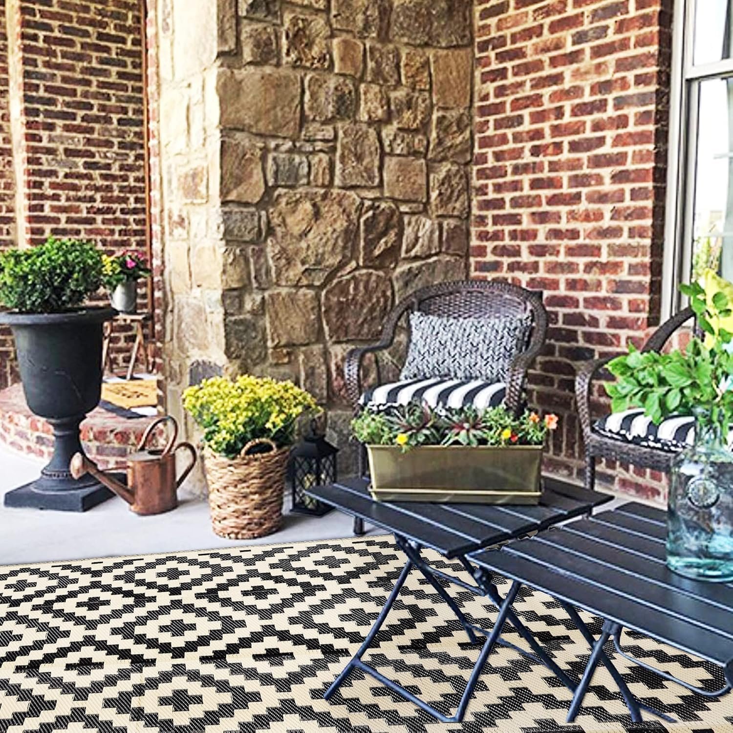 EASY CLEANING & PORTABLE: For a quick clean simply sweep away dirt with water and airing it dry. Reversible outdoor rugs can be folded into compact size for easy storage, it comes with a carrying bag for added convenience. Suitable for an afternoon outing or an RV road trip.