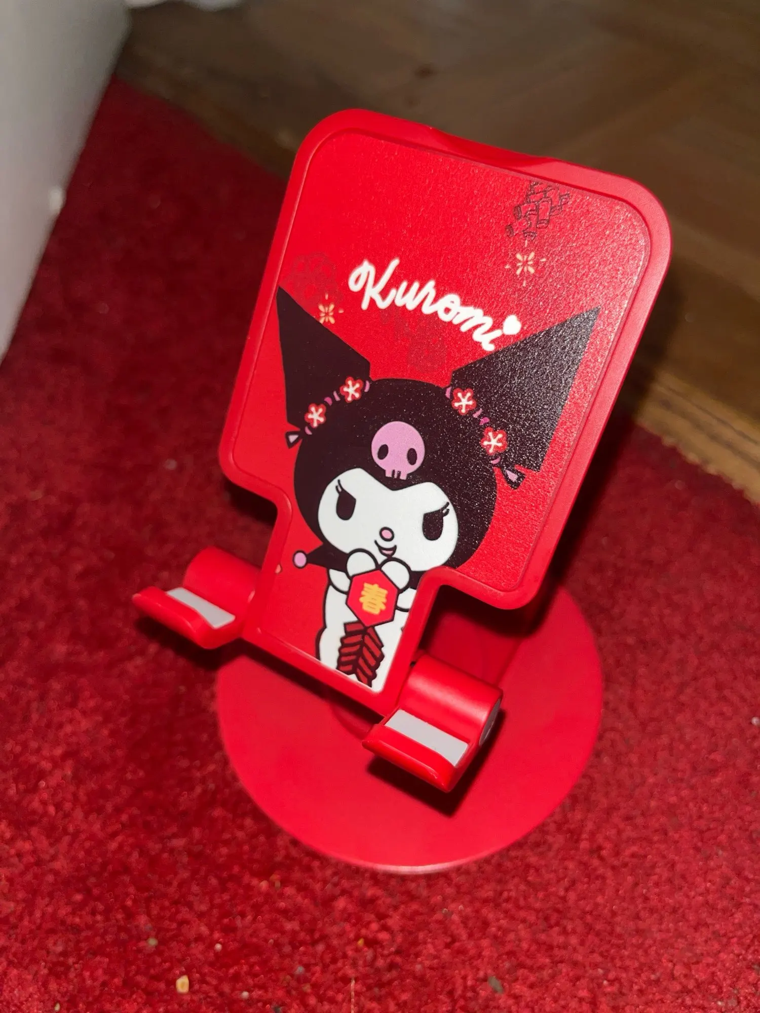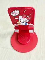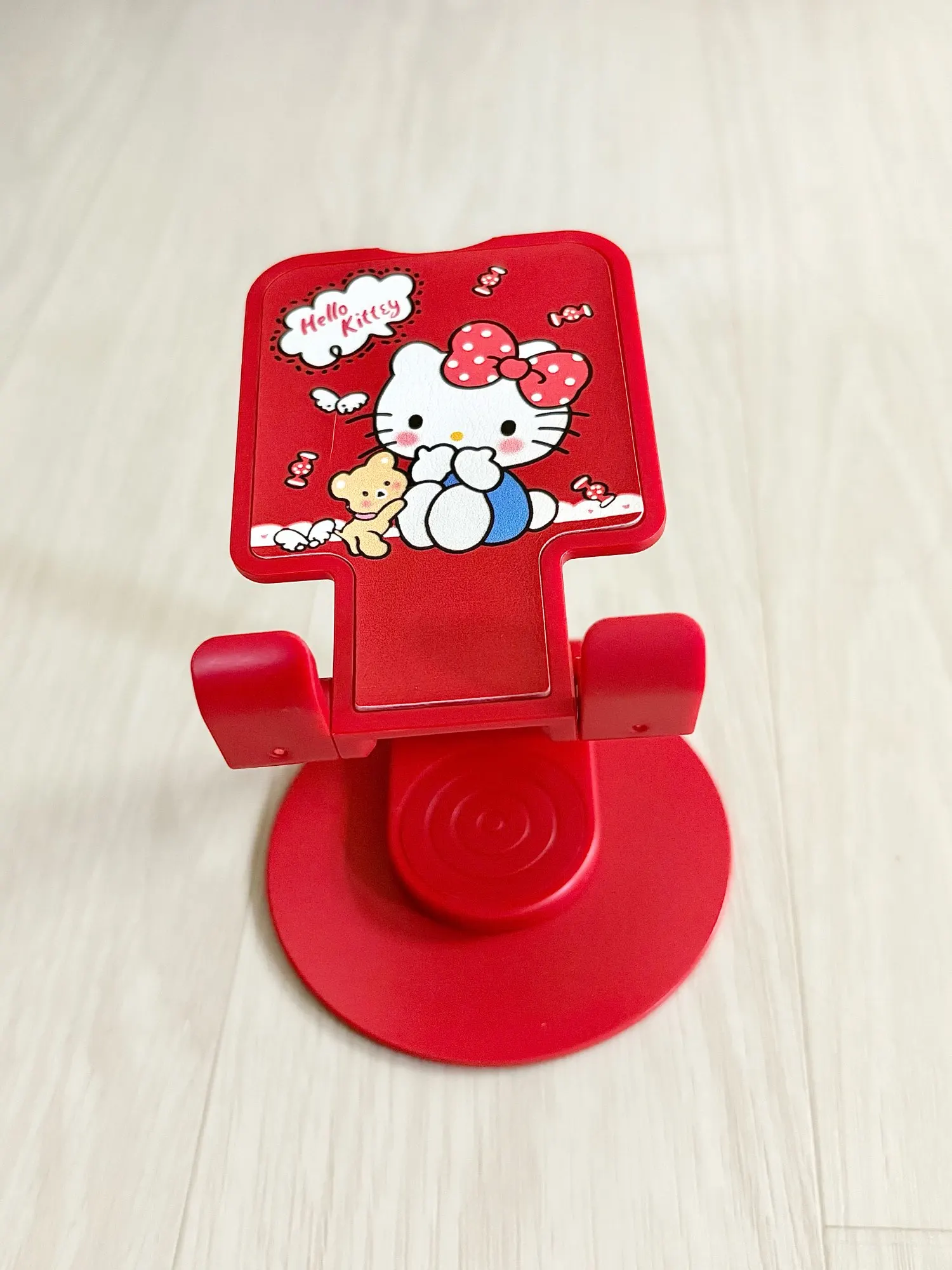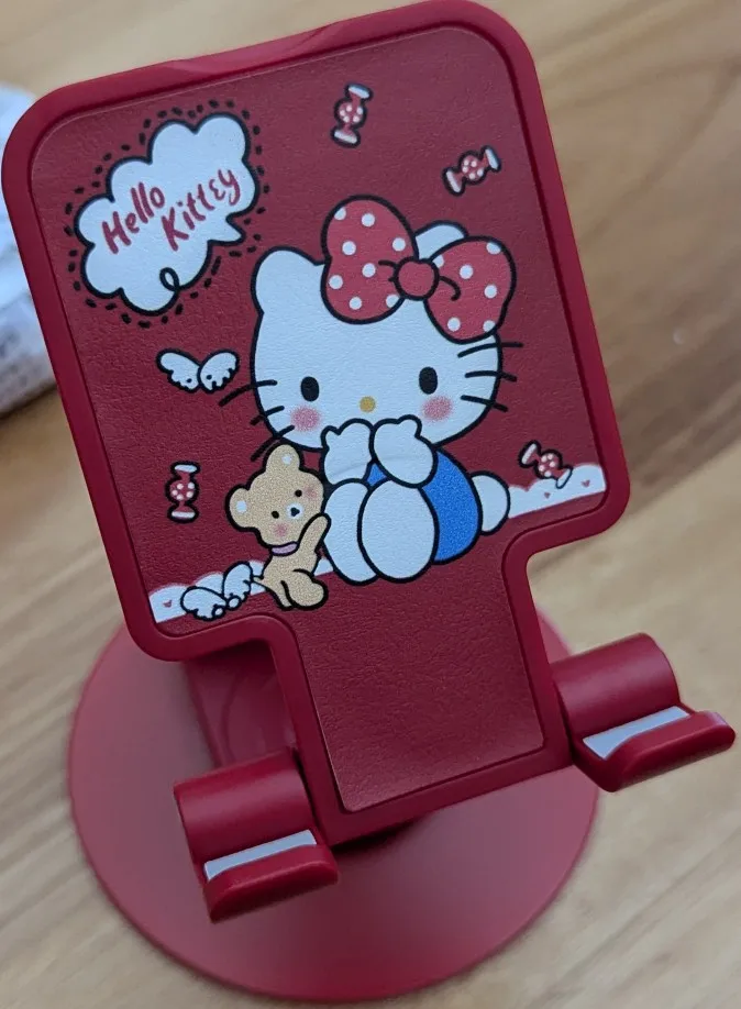 Sanrio hello kitty desk mobile phone holder stand has been well received. The picture is very cute and nice. The color is also good, i really like the red color! But the phone holder stand is a bit heavy so it is difficult to carry around when needed and the size is also quite large. The price is also quite cheap. Hopefully the phone holder stand can last a long time and not get damaged easily.
