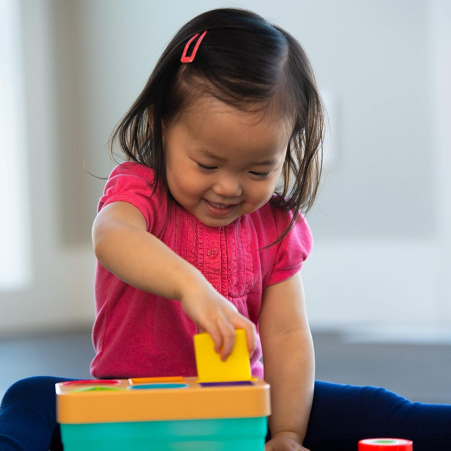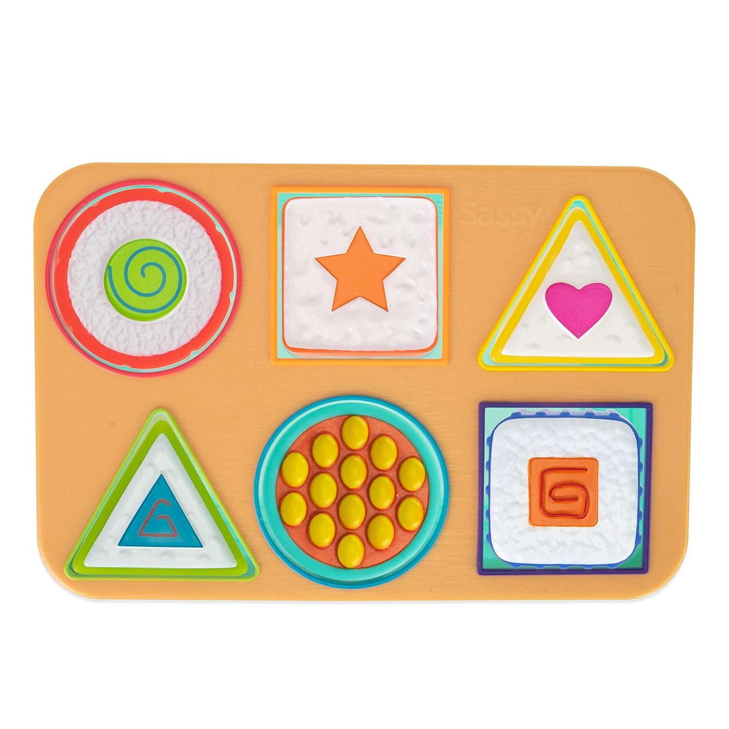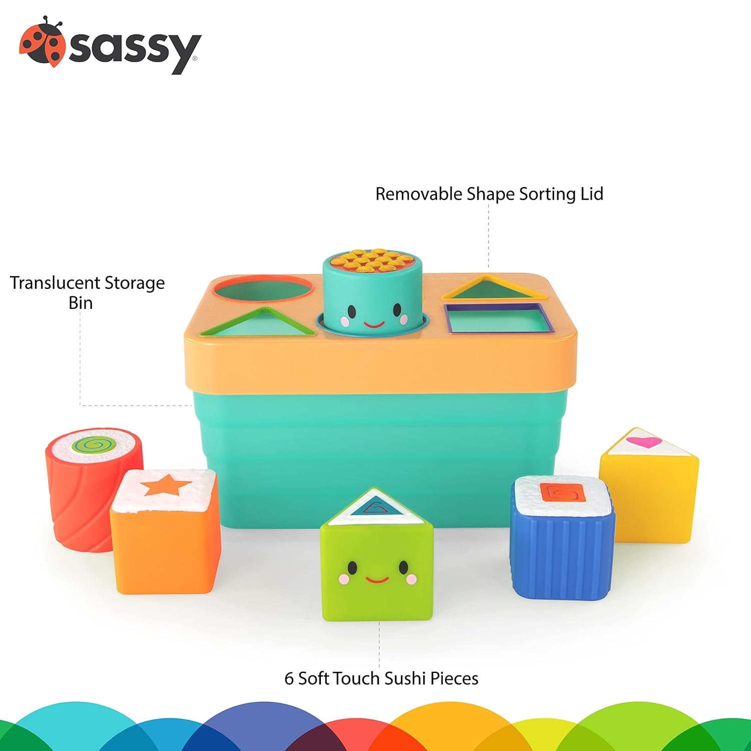 “The Sassy sushi sorter has textural sushi shaped into circles, triangles, and squares. Each sushi is colored to help baby sort the sushi through the same color and shape on the lid of the sorter. The sushi themselves are textured and soft for baby to mouth and explore for tactile development”.