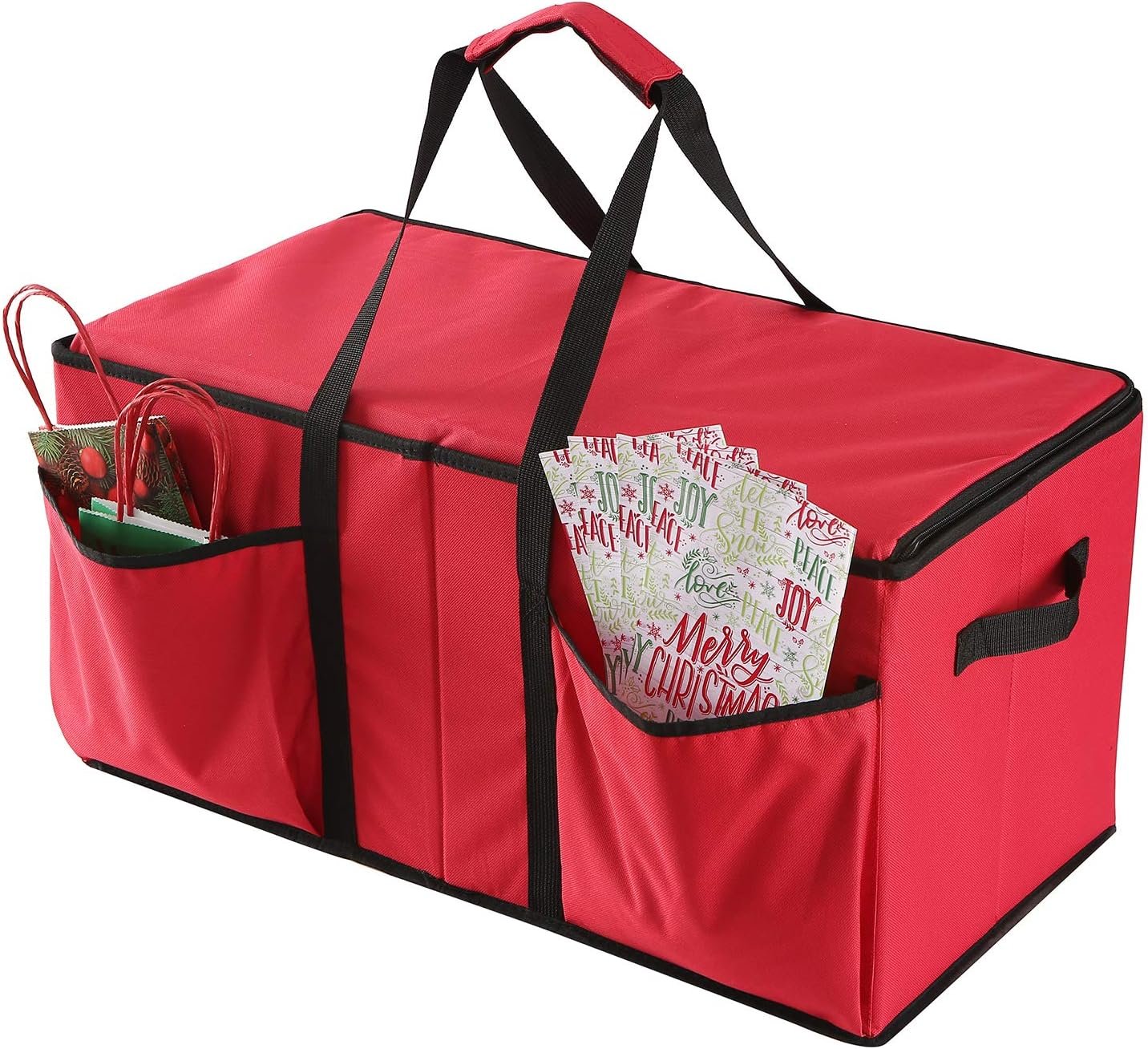 PRACTICAL STORAGE SOLUTIONS – Strong handles on both sides and top of the box allow you to easily move it to the storage room or living room. There are two additional large pockets on the side for scissors, tape, ribbons, among other items. Besides, a transparent card slot is designed for easy labeling.