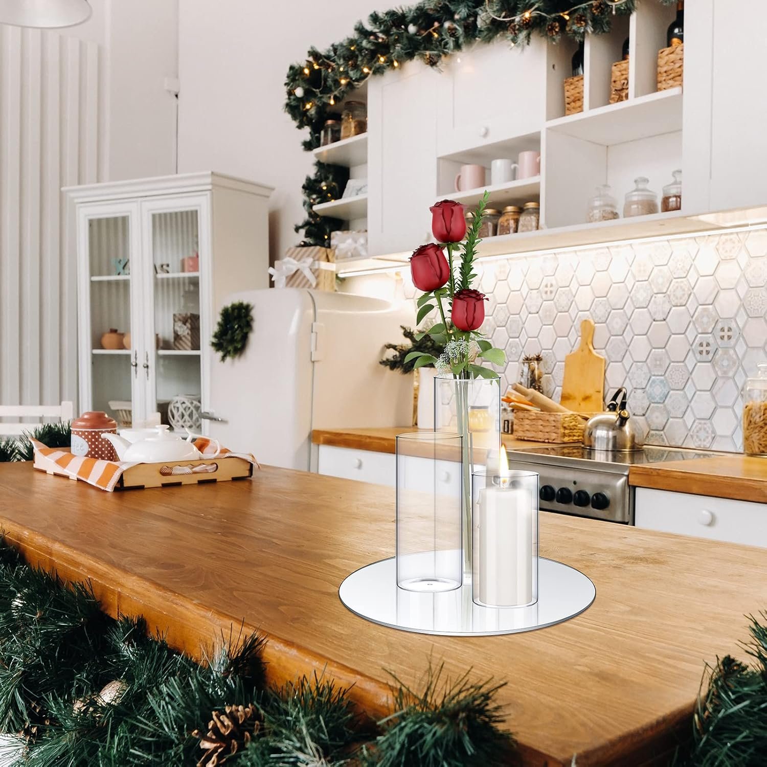 Sawysine 12 Sets 2.6” X 4.7”, 5.9”, 7.9” Round Glass Mirror Trays Glass Cylinder Vases Wedding Table Flower Vase with Mirror Set Table Centerpiece Decoration for Wedding Craft Baby Shower Party