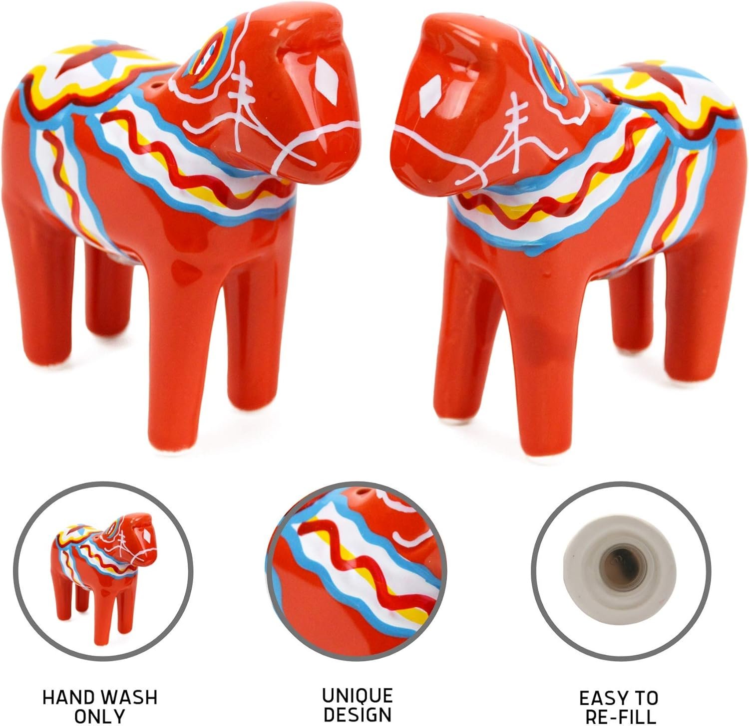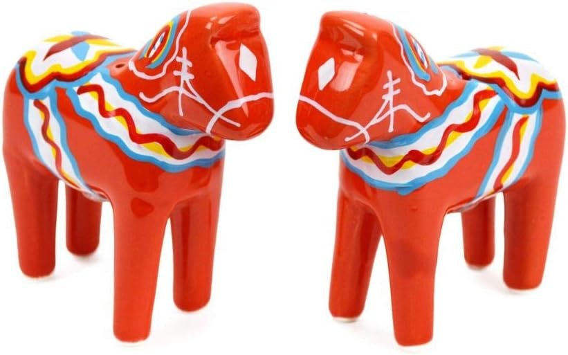 Swedish Dala Horse Design: Our 3.25″ ceramic salt and pepper shaker set is tastefully designed with a classic Swedish Dala horse motif, bringing a touch of Scandinavian home decor to your kitchen. Perfect for horse figurines collectors or those passionate about Scandinavian ornaments.