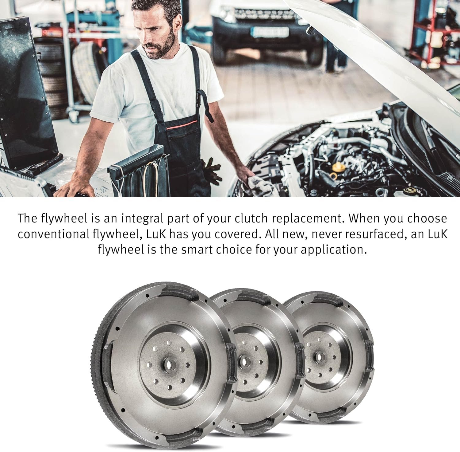 Every LuK flywheel is 100% functionally tested to meet OEM performance specifications. These clutch replacement parts can be used for various models of Car, Truck, SUV & Van, Motorcycles & Scooters as well as ATVs & UTVs. LuK engineers have developed solid flywheel replacements for some OE dual-mass applications. \n\nResurfaced flywheels may be machined beyond their usable life – a critical flaw that would not be evident until after the clutch has been installed. Over-machining removes metal needed to absorb heat, impairing the flywheel’s heat sink capacity and shortening clutch service life. Improper machining can also cause interference, no release and slipping problems.\n\nPairing your new LuK RepSet with a new LuK flywheel is a smart, cost-effective alternative to resurfacing. Easy, one-step ordering ensures that you get the right components for your application and the right fit for hassle-free installation. Don’t take chances with questionable parts. Install a new, original-equipment quality LuK flywheel and maximize the performance and service life of your clutch. \n\nPremium grade materials are used for superior-quality friction surfaces, along with excellent heat-absorption capacity. This perfectly balanced OEM flywheel is backed by LuK and the industry’s most trusted warranty.\n\nPlease check for the correct build, year and model before buying.
