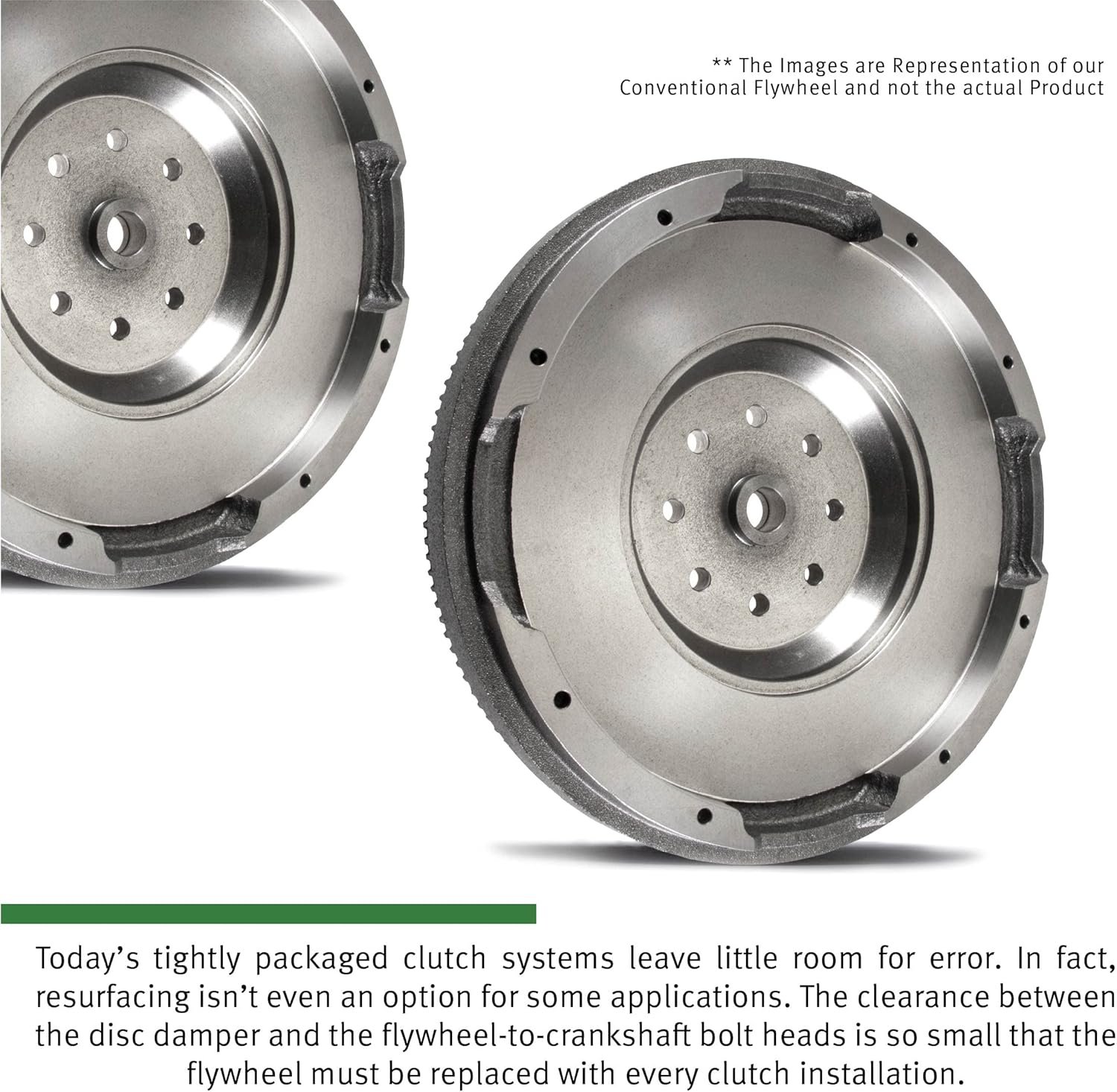 Replacement Flywheel: Today’s tightly packaged clutch systems leave little room for error. The clearance between the disc damper and the flywheel-to-crankshaft bolt heads is so small that the flywheel must be replaced with every clutch installation.