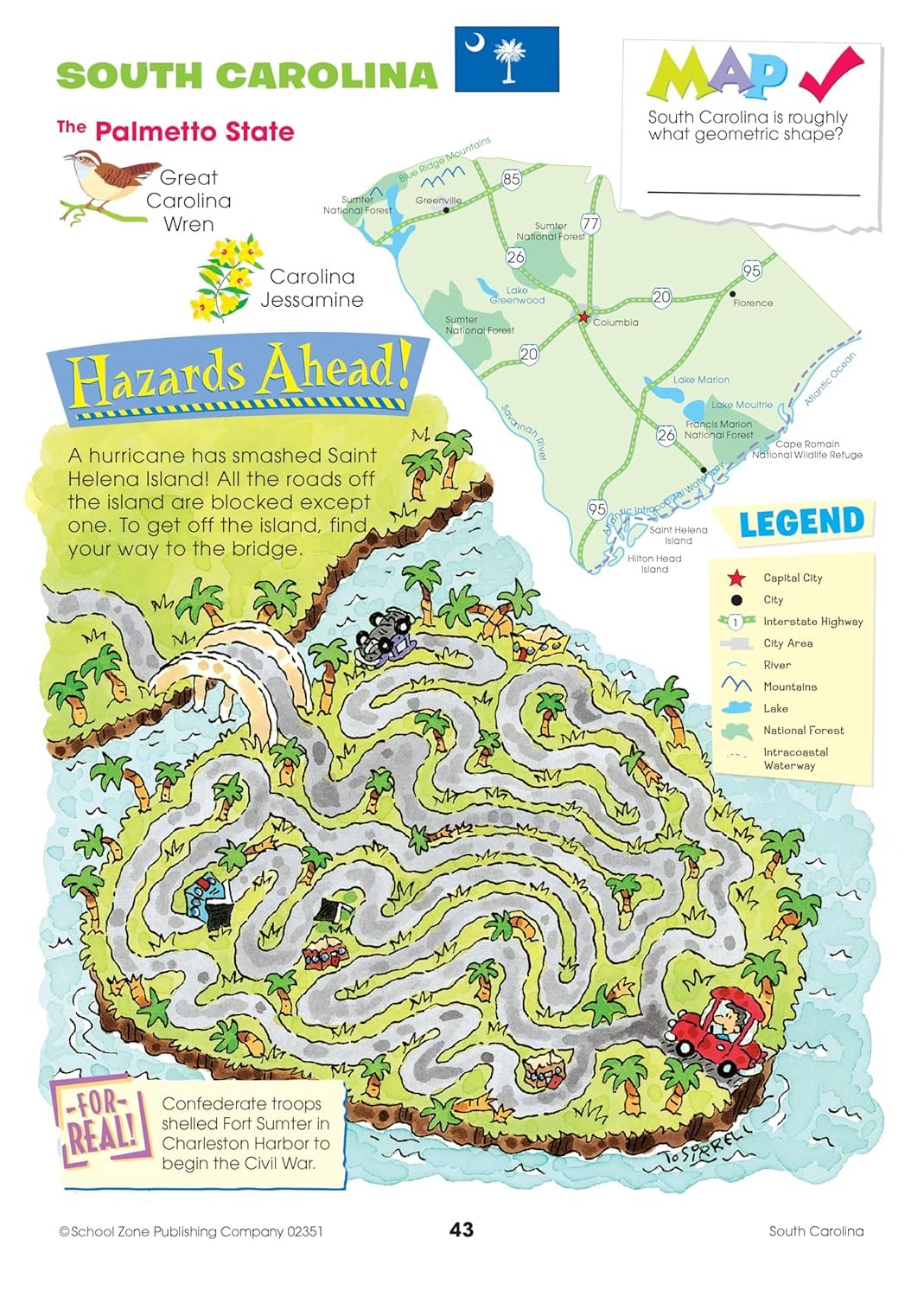 57 activity pages, 2-page map of North America (with U.S. states), and 5-page answer key For ages 8 and up 7.75″ x 10.75″ pages with durable glossy cover Challenging puzzles, map quizzes, and intriguing facts about each state sharpen geography, history, and map-reading skills Learn each state name, state flower and bird 4 pages focus on Washington, D.C., Puerto Rico, Canada, and Mexico Slim and portable, perfect for on-the-go learning! Perforated pages are easy to tear out for individual worksheets