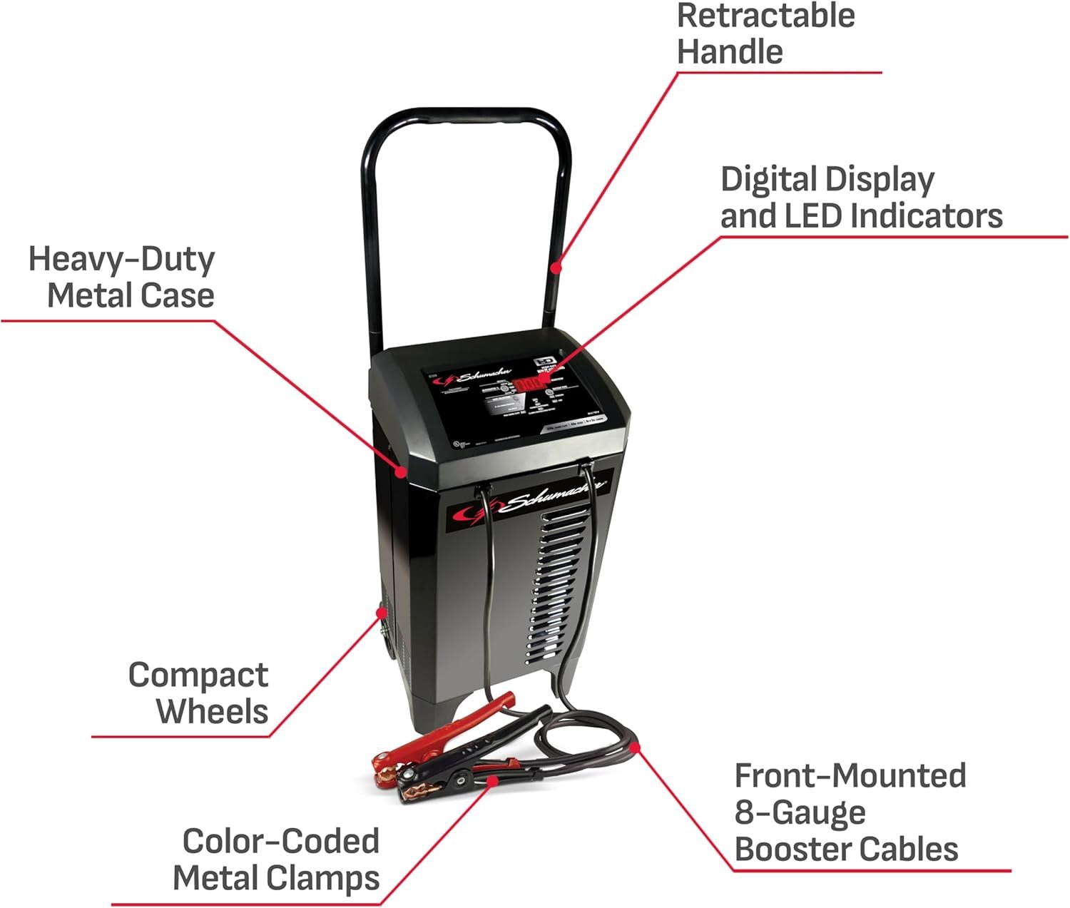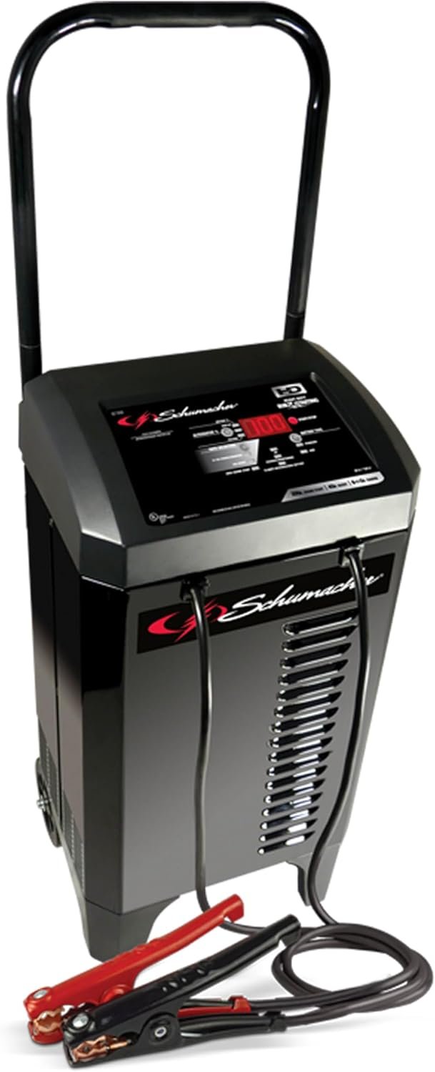 The Schumacher SC1309 battery charger 200 amp boasts extreme starting power, precision charging, and rugged durability. Featuring a 200 amp battery charger function, the dual battery charger car jump starter provides the high-output energy needed to jump-start vehicles with dead batteries. The 40A boost mode quickly revives weak batteries, while the 6/2A charge/maintain feature ensures long-term battery health through automatic multi-stage charging, making it a reliable auto battery charger for car and truck battery charger applications. Designed for heavy-duty automotive use, this car battery charger heavy duty model includes a digital display with LED indicators for easy monitoring. The push-button start/stop interface and auto voltage detection (6V and 12V) simplify operation, ensuring seamless performance across various vehicles. Its built-in battery and alternator tester provides real-time diagnostic capabilities, allowing users to detect electrical issues before they escalate. The SC1309 is a battery charger on wheels, featuring front-facing clamps, a retractable handle, and compact wheels for effortless portability and storage. Microprocessor-controlled technology automatically adjusts the amperage rate, preventing overcharging and optimizing battery life. The float mode monitoring system maintains an ideal charge, making it a perfect battery recharger for garages, auto shops, and DIY enthusiasts who need reliable car battery chargers they can truly count on. Backed by Schu Eco Energy certification and DOE compliance, this car battery charger meets the highest industry standards for efficiency and safety. Whether you’re working on a car, truck, SUV, or marine vehicle, the Schumacher SC1309 ensures powerful, reliable performance for all your battery charging and engine-starting needs.