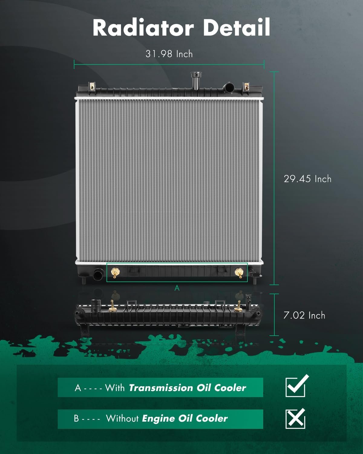 [Specifications]: Radiator Replacement: ①Transmission Oil Cooler Included:Yes; ②Engine Oil Cooler Included: No; ③Inlet Diameter: 1 3/8in.; ④Outlet Diameter: 1 3/8in.