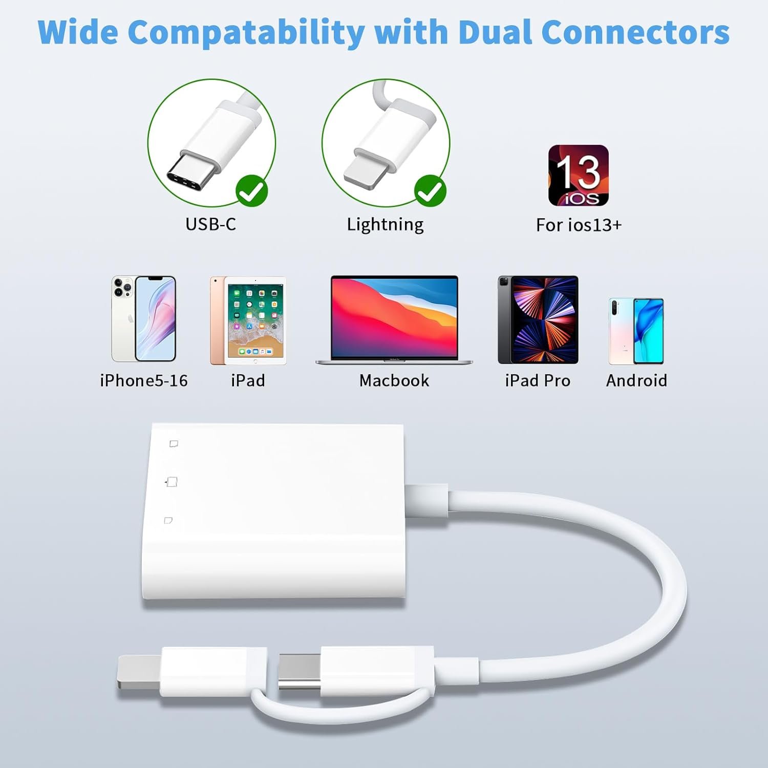 Lightning&USB C SD Card Reader: The Aplimln SD Card Reader for iPhone features dual interfaces, including a USB-C connector and an extra Apple MFI certified Lightning interface, ensuring compatibility with a wide range of devices, such as iPhone 5-16 (ios 13+), iPad, MacBook, Android Phone/laptop and other type c devices. Please note that both connectors can not be used simultaneously