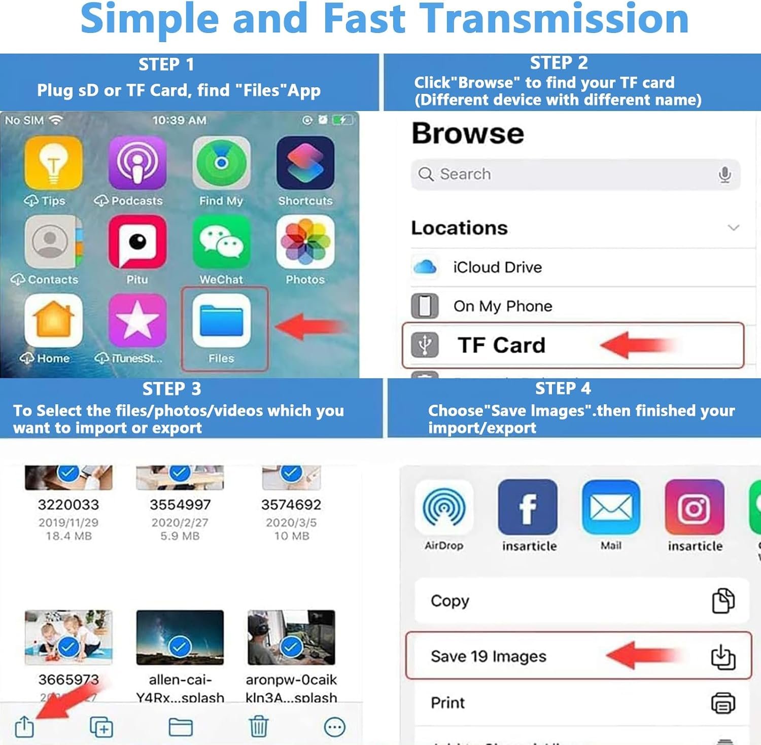 Comprehensive Format Support: This memory card reader supports various SD card and micro SD card, including SD, SDHC, SDXC, MicroSD. It accommodates standard photo formats such as JPEG and RAW, as well as 4K video formats like H.264 and MPEG-4. Perfect for photographers seeking high-quality data transfer with an adapter for digital camera to iphone