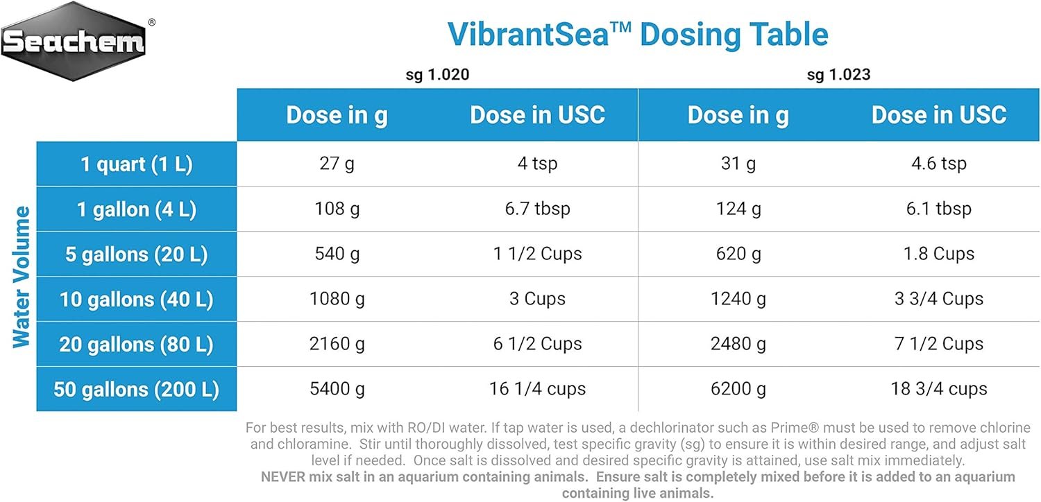 CARE: When using Vibrant Sea, mix with dechlorinated tap or purified water, then stir the product well until thoroughly, but not excessively, dissolved. For reef aquariums, 1.020 – 1.025 at 24°C (75°F) is recommended. Never mix Vibrant Sea in an aquarium containing animals.