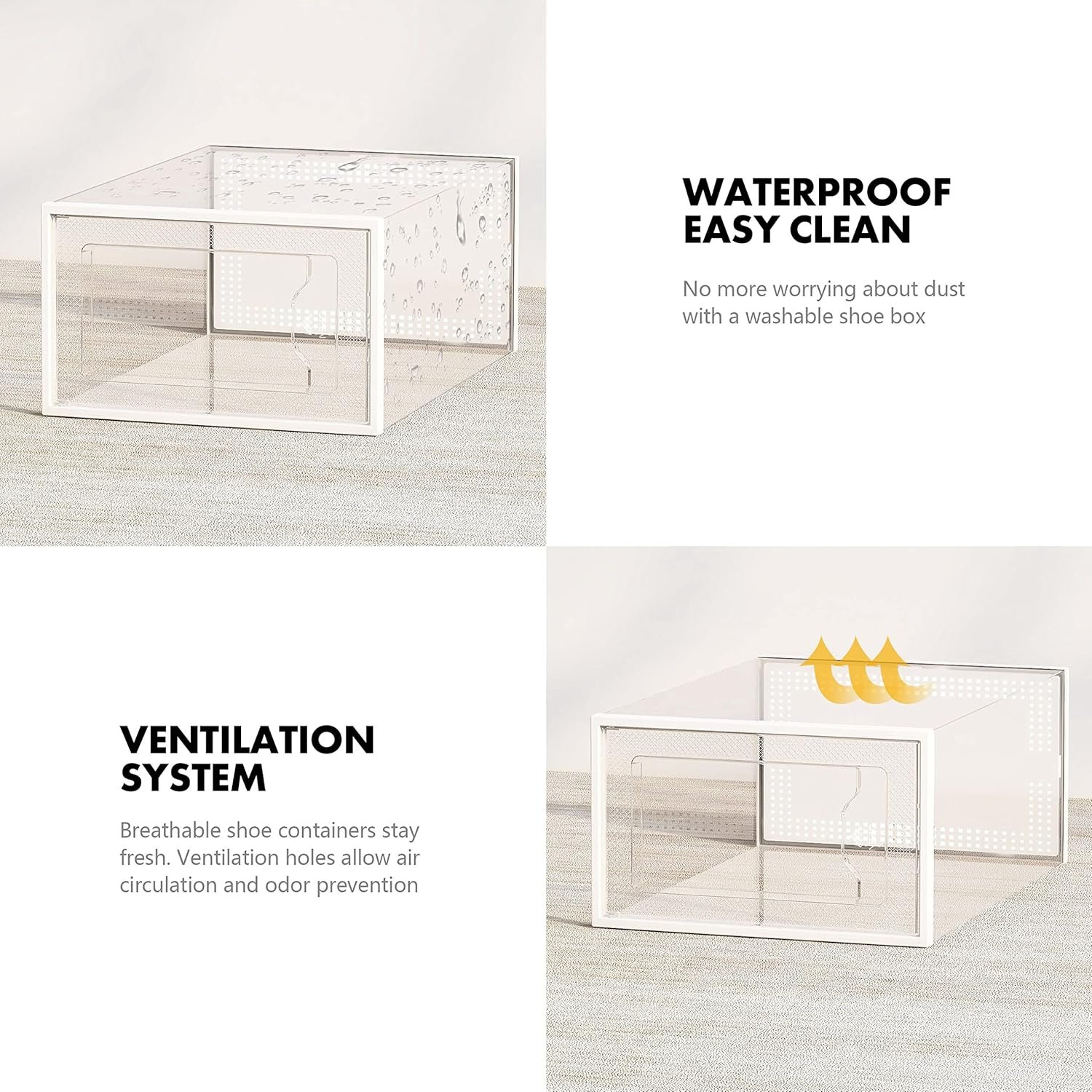 Sturdy yet Breathable: Made of sturdy and durable premium plastic. Large rear ventilation holes ensure air circulation and odor prevention, breathable shoe containers stay fresh. Easy daily care – clean with mild soap and water.
