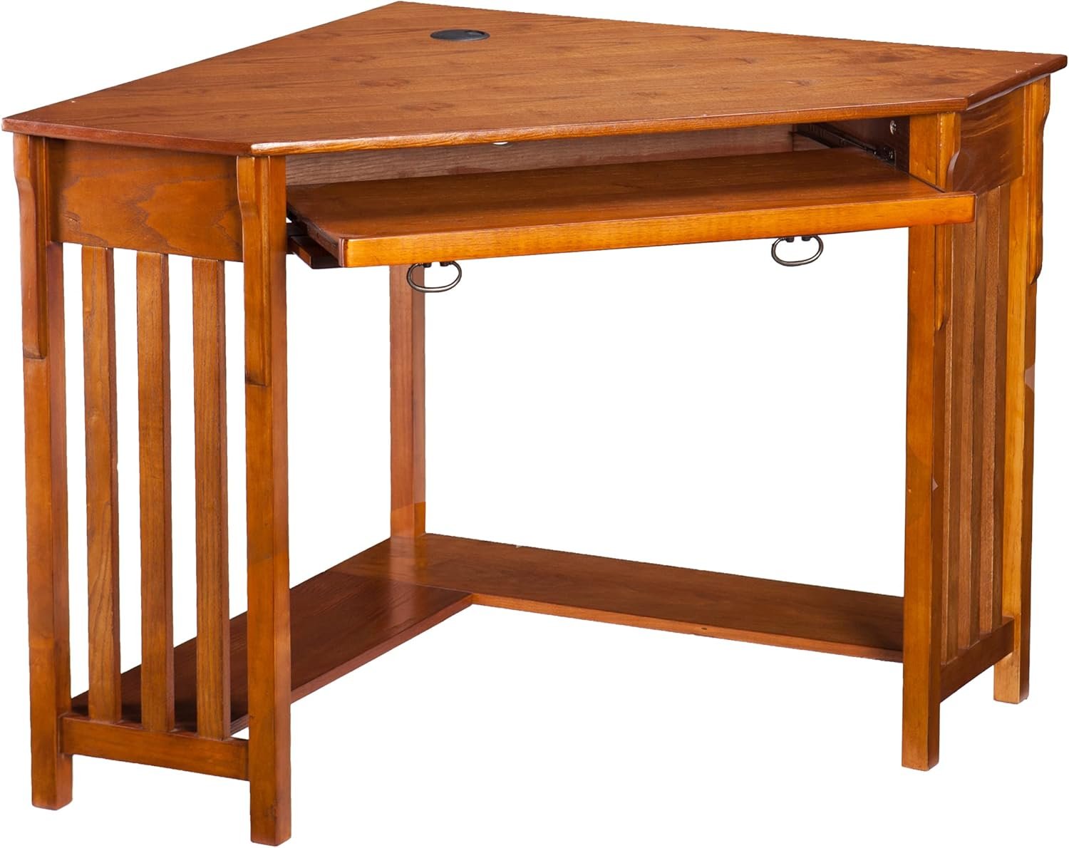 SEI FURNITURE Small Corner Computer Desk – Mission Oak Wood Finish w/ Gun Metal Hardware – Space Saving