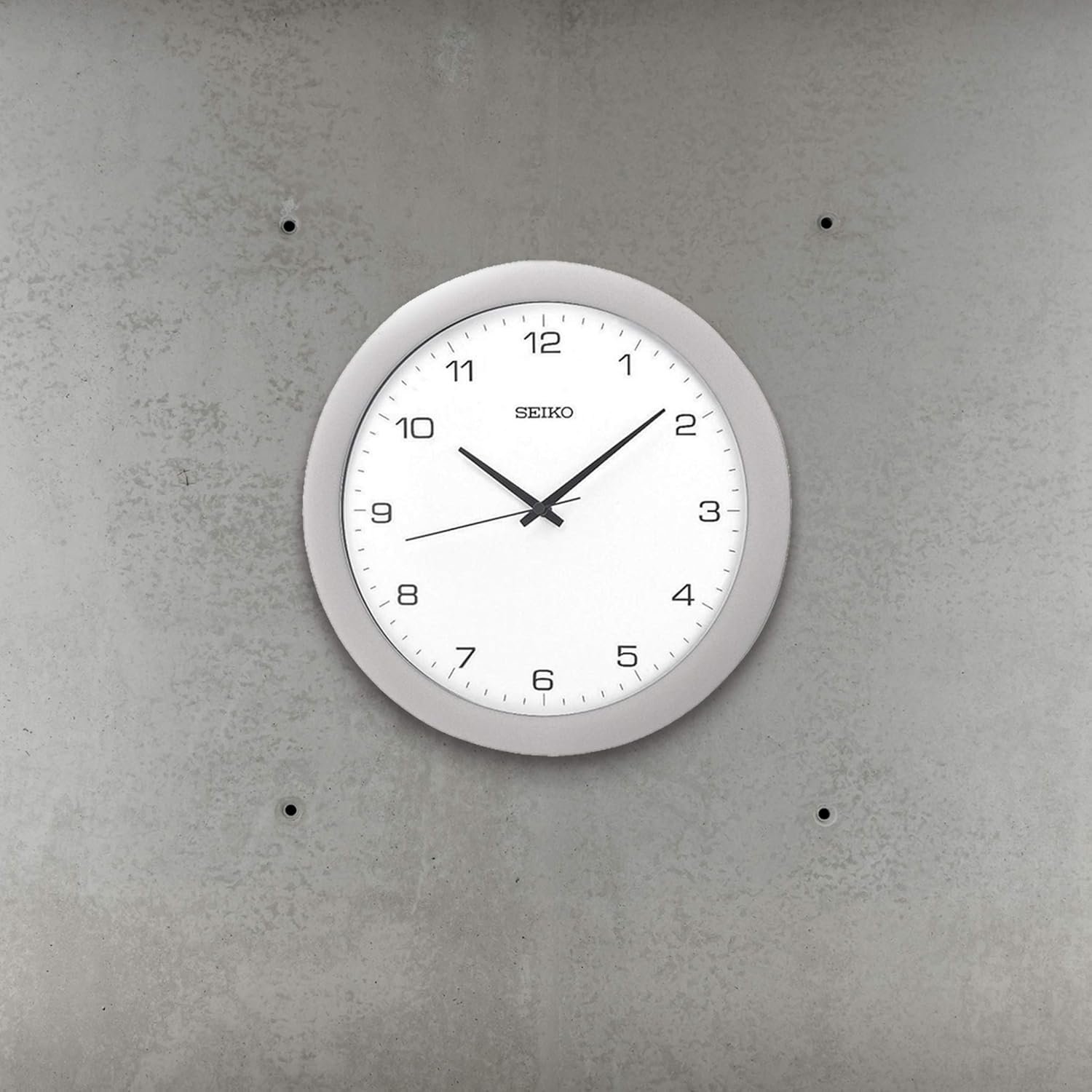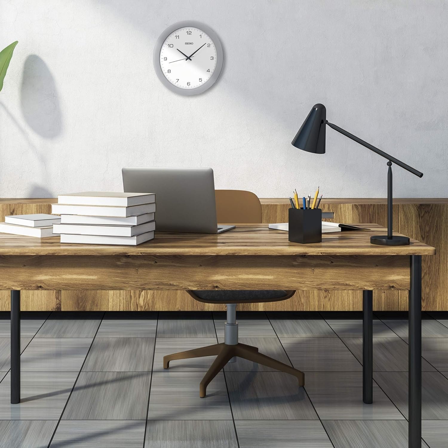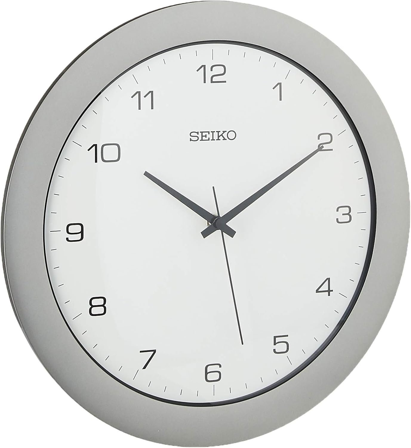 Stylish timekeeping. With a brushed silver metal frame, this round wall clock pops with a white face and black details. Ideal for your home kitchen, office, or classroom, and this contemporary clock features precise quartz movement.
