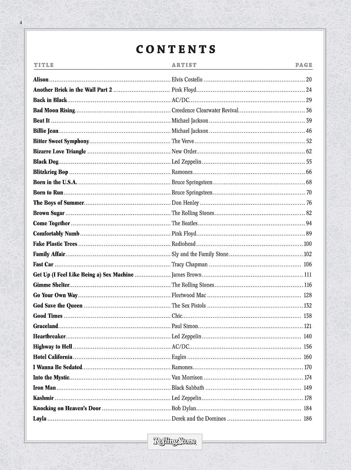 Songs Include: Alison * Another Brick in the Wall Part 2 * Back in Black * Bad Moon Rising * Beat It * Billie Jean * Bitter Sweet Symphony * Bizarre Love Triangle * Black Dog * Blitzkrieg Bop * Born in the U.S.A. * Born to Run * The Boys of Summer * Brown Sugar * Come Together * Comfortably Numb * Fake Plastic Trees * Family Affair * Fast Car * Get Up (I Feel Like Being a) Sex Machine * Gimme Shelter * Go Your Own Way * God Save the Queen * Good Times * Graceland * Heartbreaker * Highway to Hell * Hotel California * I Wanna Be Sedated * Into the Mystic * Iron Man * Kashmir * Knocking on Heaven’s Door * Layla * Like a Prayer * Lola * London Calling * Losing My Religion * Lust for Life * Maggie May * Moondance * No Woman, No Cry * Paradise City * Paranoid * Paranoid Android * (What’s So Funny ‘Bout) Peace Love and Understanding? * Personality Crisis * Radio Free Europe * (Don’t Fear) the Reaper * Respect * Sheena Is a Punk Rocker * Should I Stay or Should I Go * Spirit in the Sky * Stairway to Heaven * Stayin’ Alive * Sweet Child O’ Mine * Tangled Up in Blue * Thank You (Falettinme Be Mice Elf Agin) * Thunder Road * Walk on the Wild Side * Welcome to the Jungle * What’s Going On * Whipping Post * Whole Lotta Love * Wild Horses * Wish You Were Here * You Can’t Always Get What You Want.”