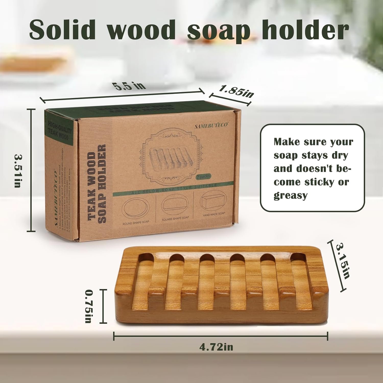 Non-Slip Teak Wood Soap Holder:The gently curved surface helps keep soap in place after each use. No sliding, no mess — just a functional bar soap holder made to fit seamlessly on your shower shelf, vanity, or countertop