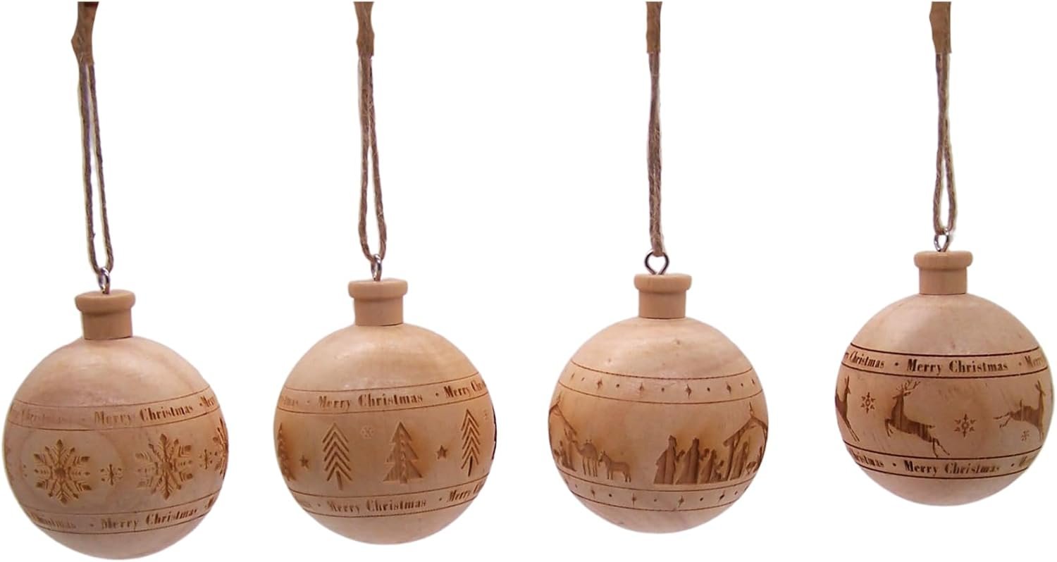 Set of 4 Wooden Ball Christmas Ornaments, Festive Hanging Holiday Décor, Assorted Designs, 2.4 Inches