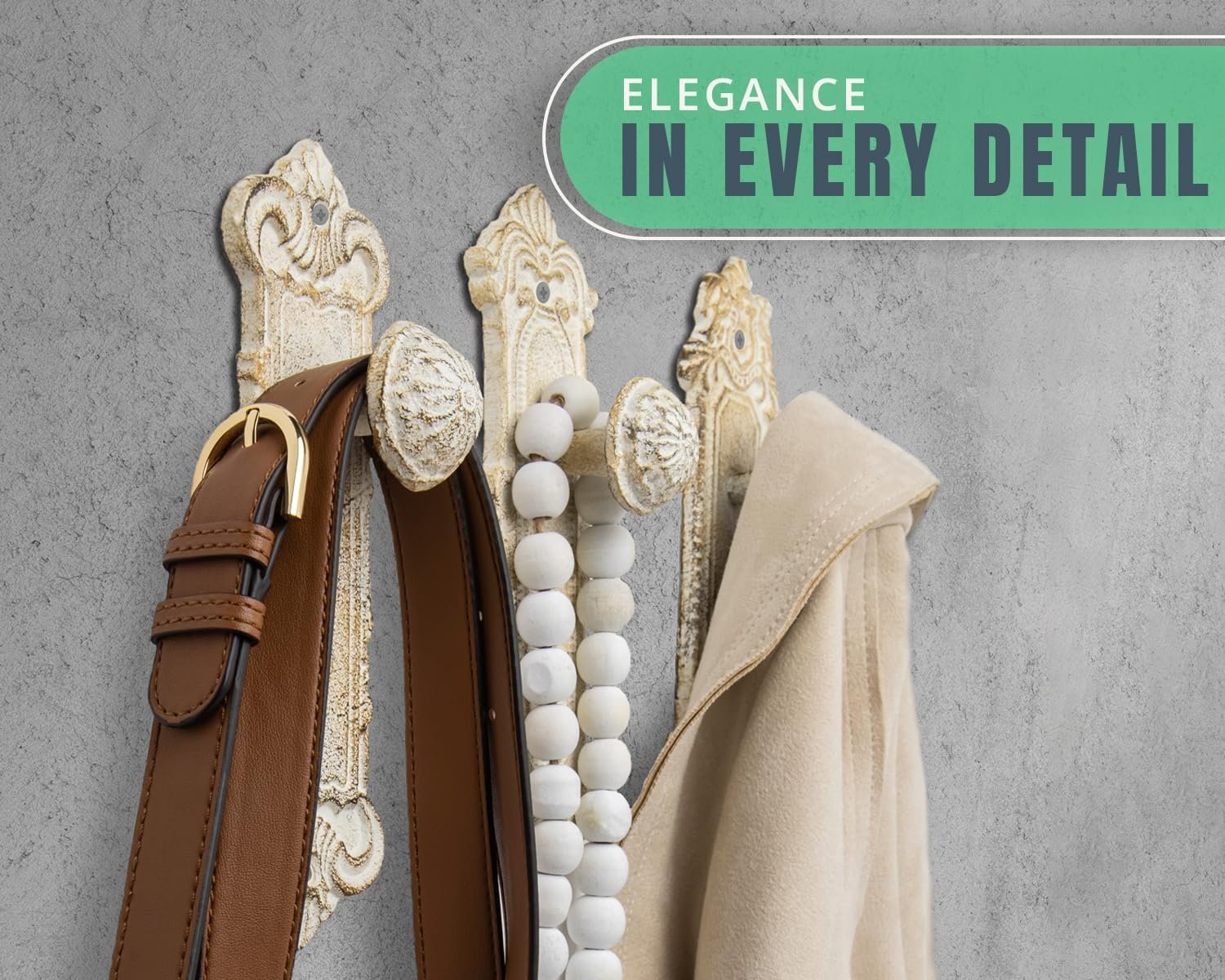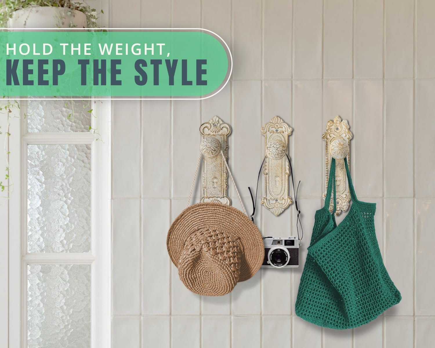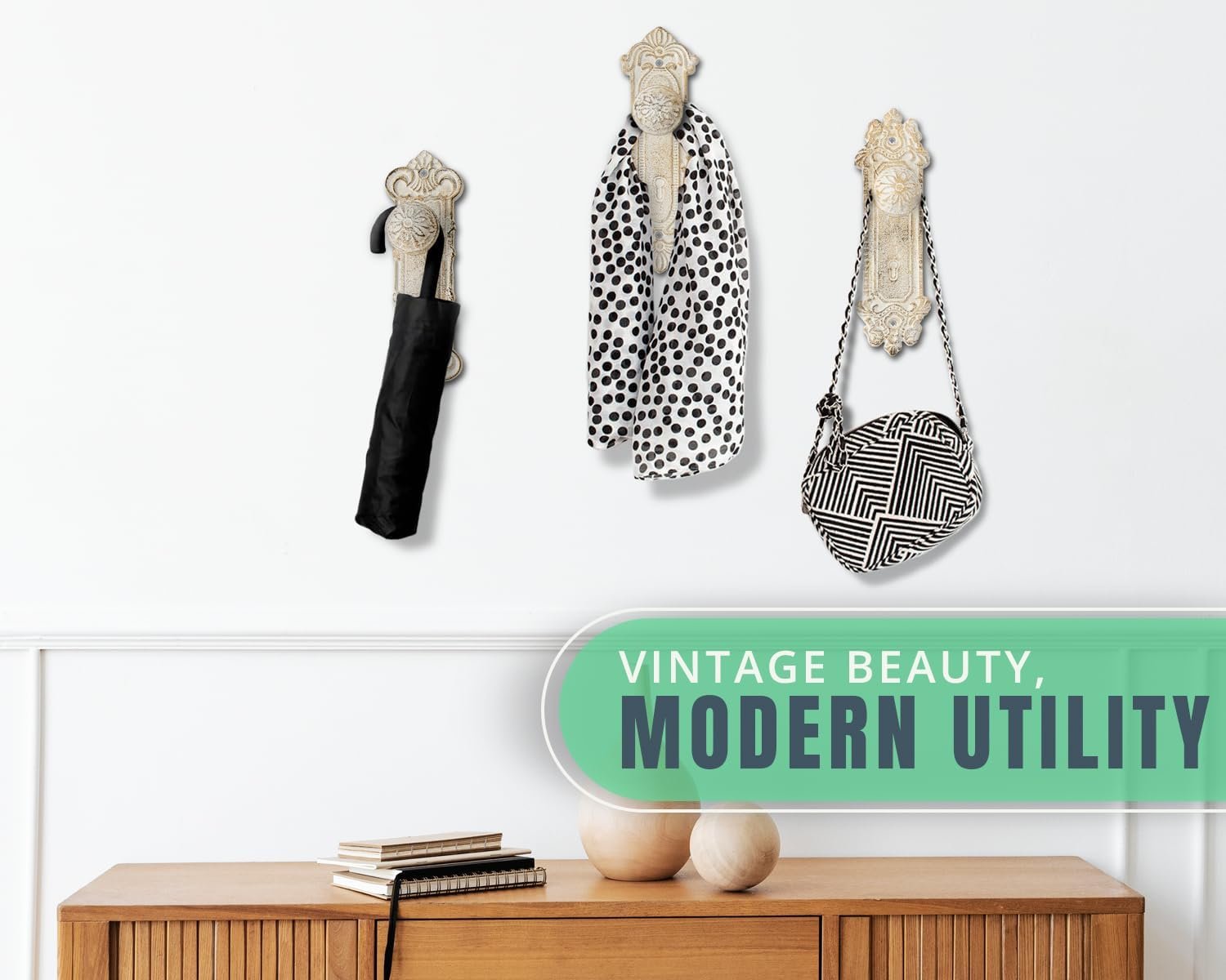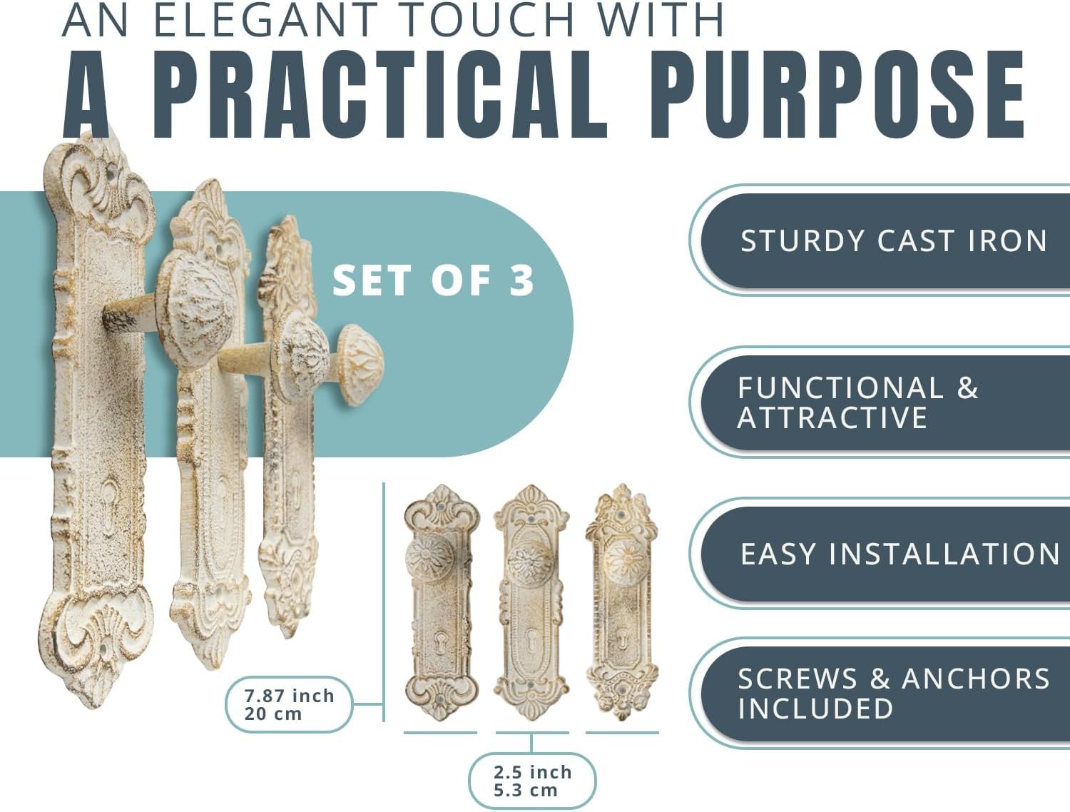 Shabby Chic Cast Iron Decorative Wall Mounted Hooks – Rustic White – Door Knob Coat Hooks for Wall – Set of 3 – Screws and Anchors Included – Antique Wall Hooks for Hanging Clothes