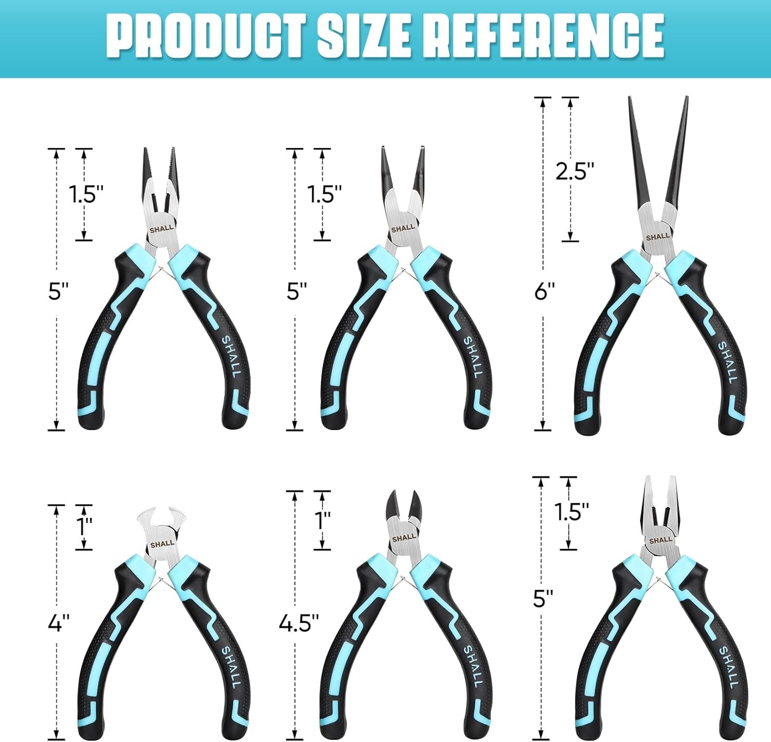 Set Including: All-in-one mini pliers set includes 6’’ needle nose pliers, 4.5’’ diagonal cutting pliers, 5’’ bent nose pliers, 5’’ long nose pliers, 5’’ linesman pliers, 4’’ end cutting pliers and comes with a portable compact storage pouch