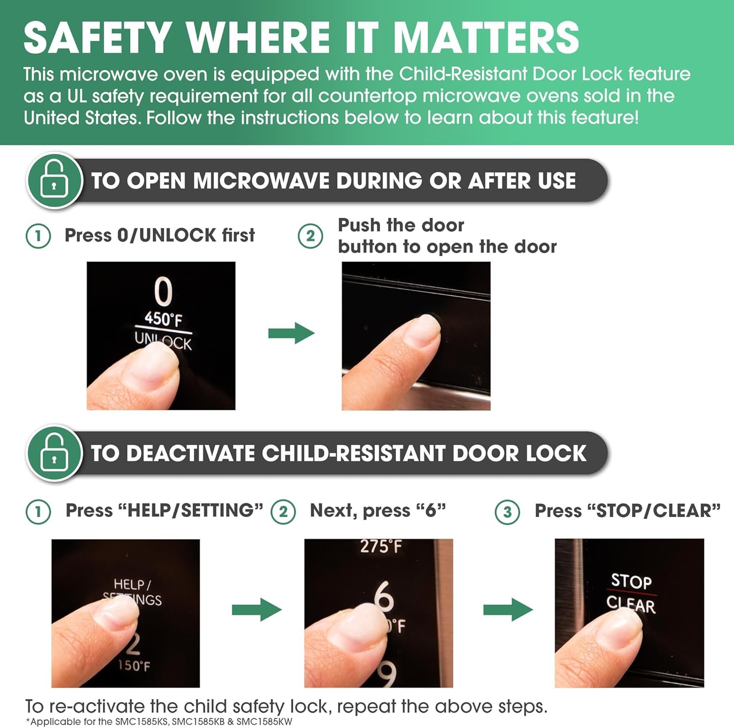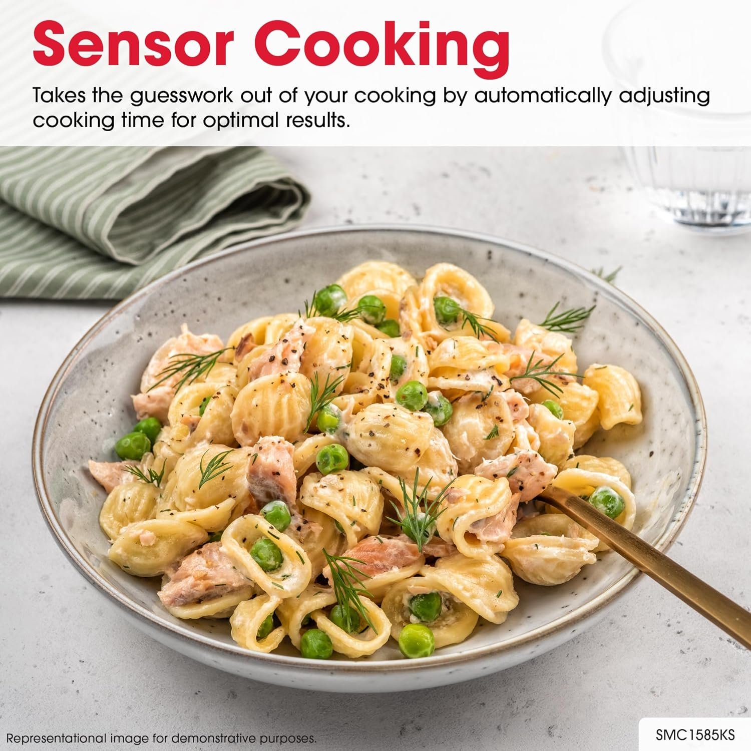 The SMC1585KS is packed with thoughtful and innovative features. Precise Cook sensor technology takes the guesswork out of defrosting and cooking, and makes reheating food and beverages a breeze. Express Cook offers One-Touch cooking for up to six minutes. The SMC1585KS has a convenient “+60 seconds” key for instant start, a convection cooking option, convenient popcorn and beverage settings, and precise cook sensor technology. Low Mix, High Mix, and Slow Cook modes give you the flexibility you need to confidently cook.