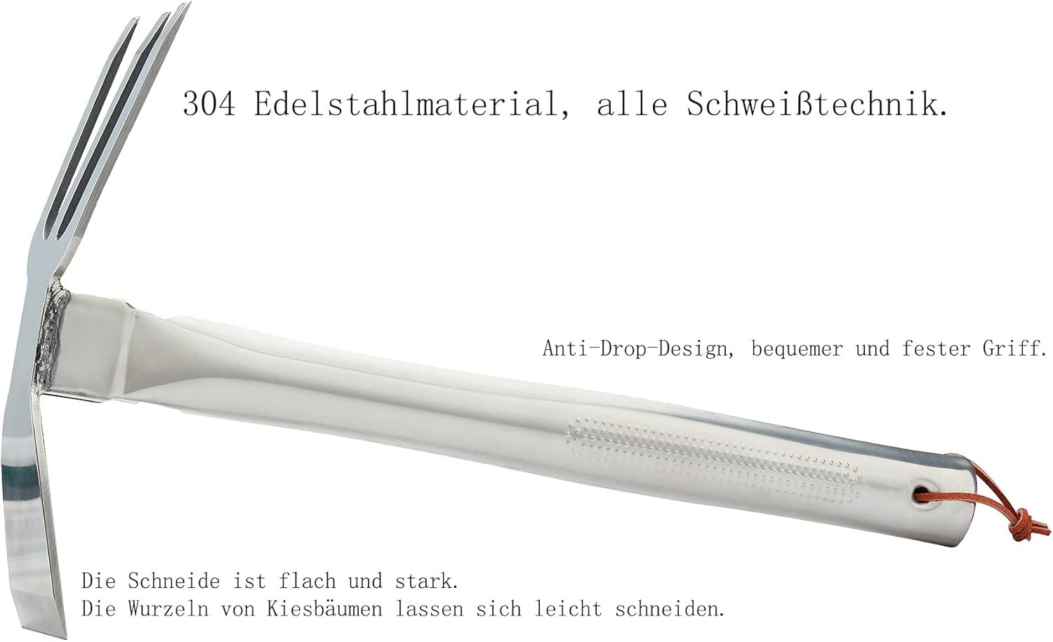 【Garden pick and hoe】. Our picks and hoes are welded in 416 stainless steel. Can be used for more than 10 years. The sharp stainless steel garden hoe is great for weeding, breaking up compacted soil, roots and digging trenches.