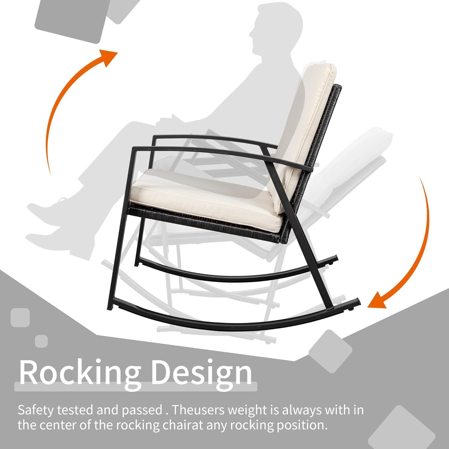 Comfortable Rocking Sets: Thick cushioned chairs for maximum comfort.Bottom cushion has zipper for easy washing. Rocking feature to rock yourself and your guests into a state of relaxation, specially designed to make a better use of your porch, outdoor patio, and backyard space.